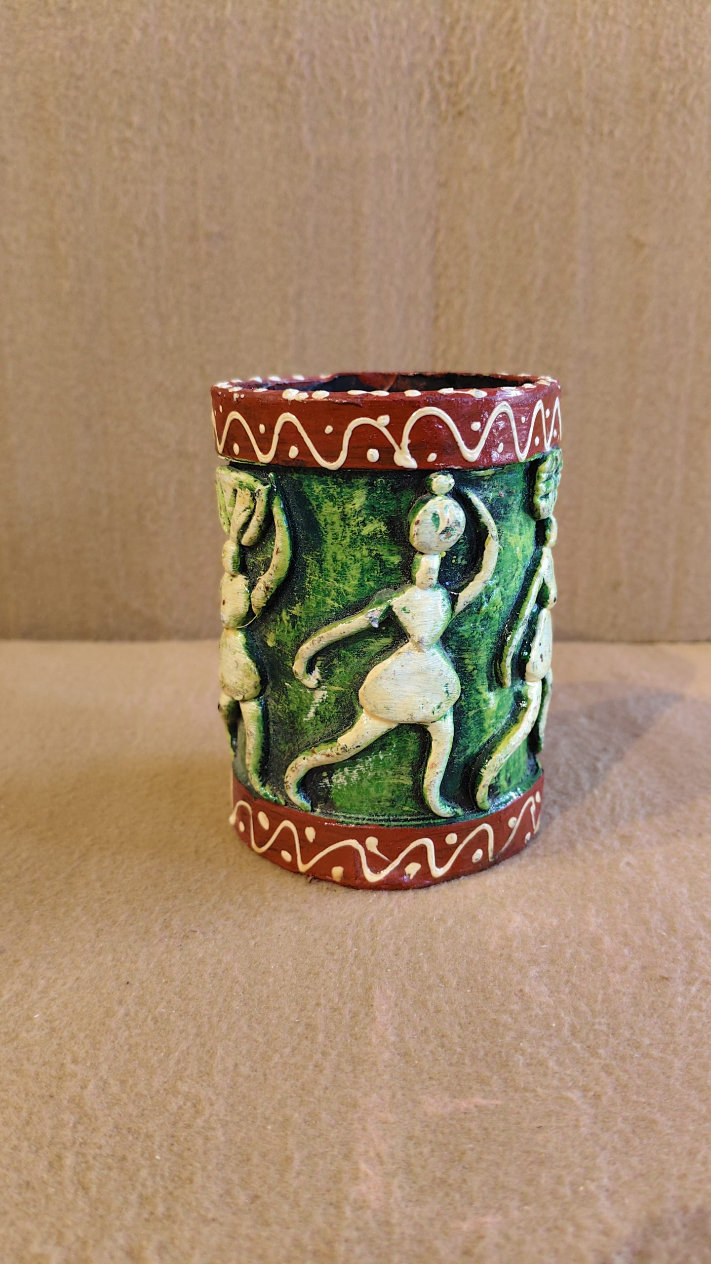 The raised texture of the figures gives the pot a tactile and sculptural feel, making it a truly one-of-a-kind piece. It’s a perfect blend of traditional folk art and a modern, artistic technique. This pot can be used as a small planter for a succulent, a holder for pens or brushes, or simply as a standout decorative item on a shelf or desk.