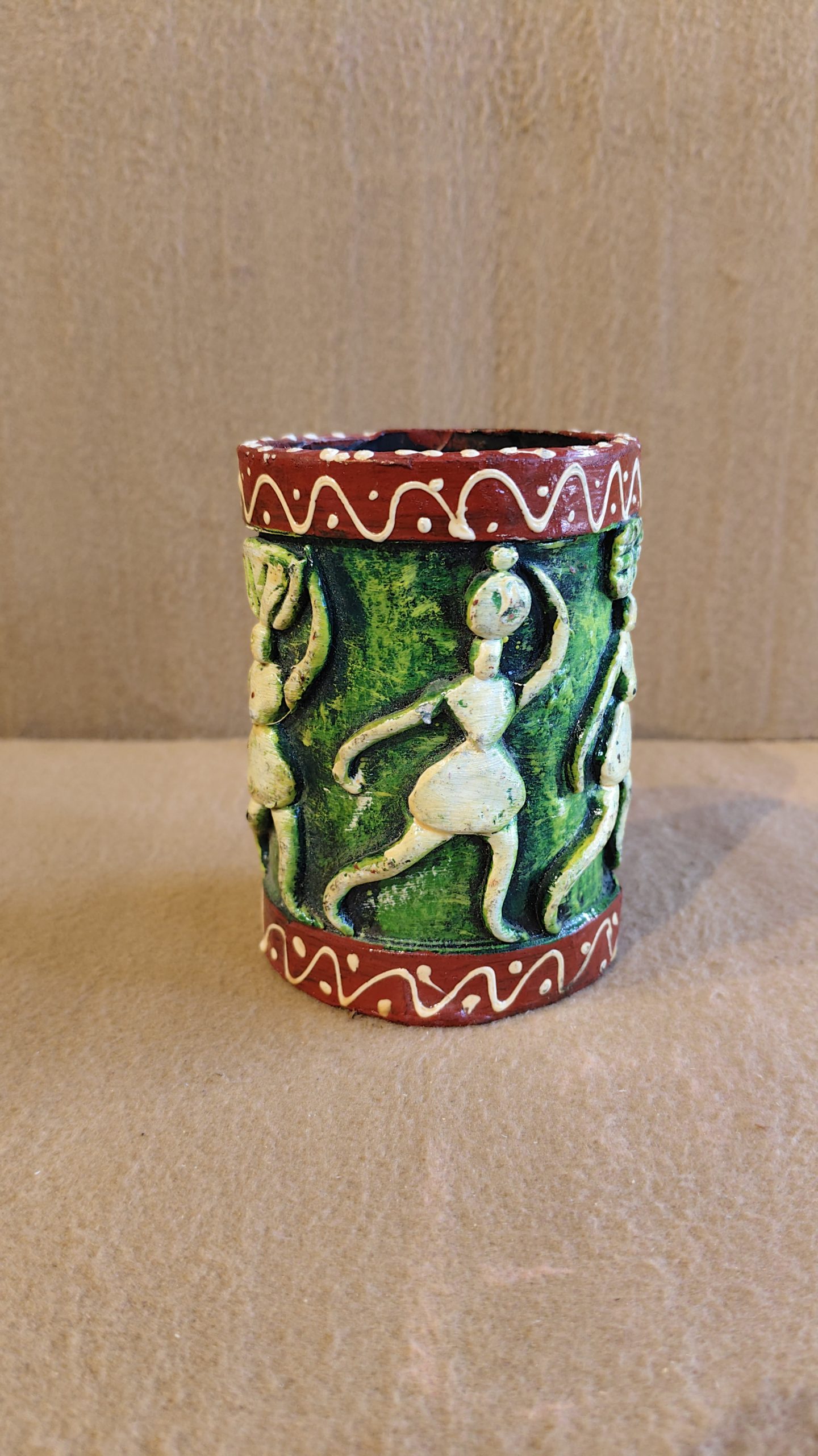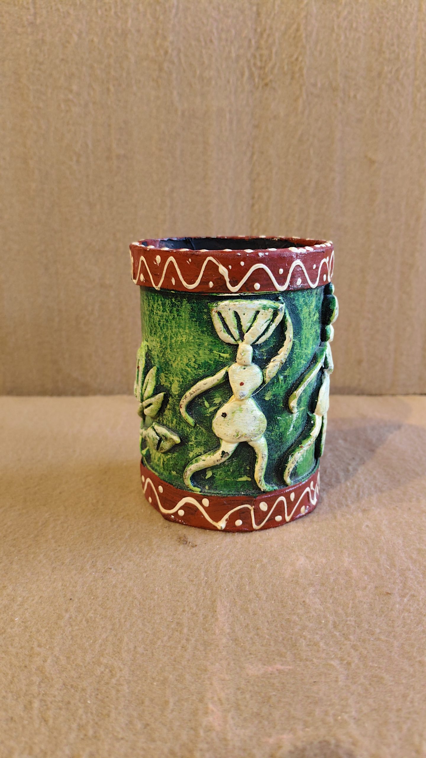 This unique terracotta pot is a creative and textural interpretation of traditional Warli art. Unlike the usual flat paintings, this piece features a three-dimensional design, with the Warli figures raised from the surface of the pot. The figures, depicted in a dancing or celebratory pose, stand out with their off-white color against a rich, textured green background. The pot is framed by two bands of deep red, each decorated with a white swirling line pattern, creating a striking contrast.