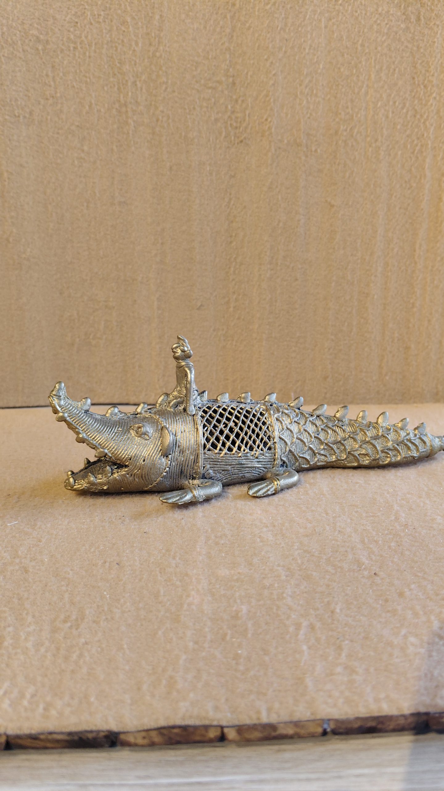 - Design: It is a figurative sculpture of a crocodile or alligator, showcasing intricate details such as textured scales, articulated feet, and a prominent, toothy snout.