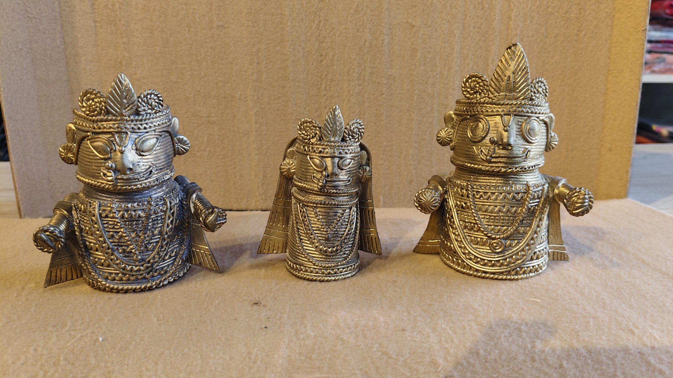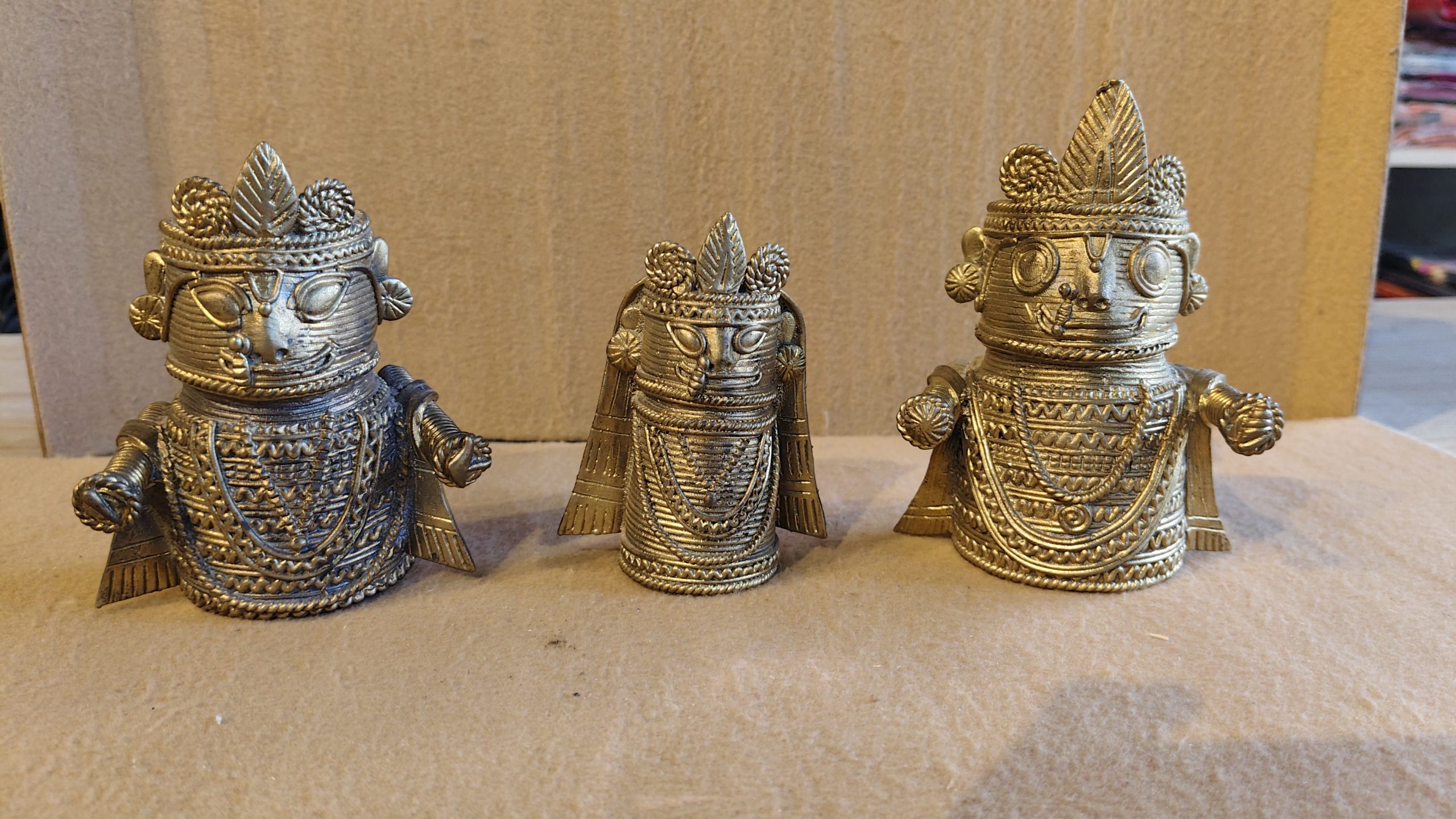 Each idol is meticulously crafted with a rustic, antique finish that highlights the rich details. The figures are adorned with intricate patterns, traditional jewelry, and elaborate headgear, all created with fine wire work that is a hallmark of the Dhokra style. The textured surface and rustic appeal give the idols a timeless and authentic look. This set is a perfect blend of spiritual devotion and ancient craftsmanship, making it a powerful and meaningful addition to any home, office, or altar.