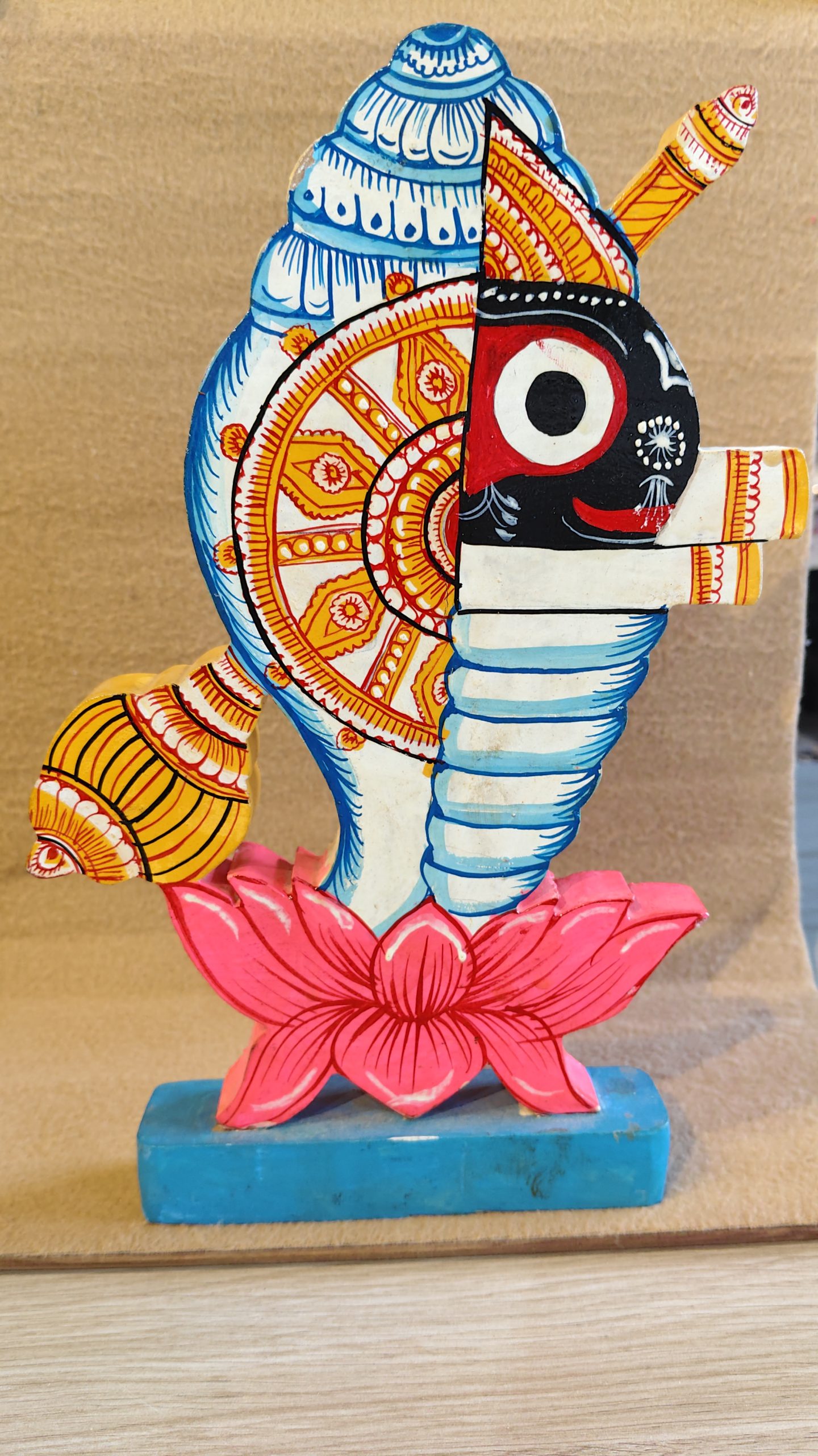 Infuse your space with spiritual elegance and traditional art with the “Divine Fusion” showpiece. This handcrafted wooden sculpture beautifully combines sacred elements — the Shankha (conch shell), Chakra (disc), and the divine face of Lord Jagannath, all emerging from a vibrant lotus base.