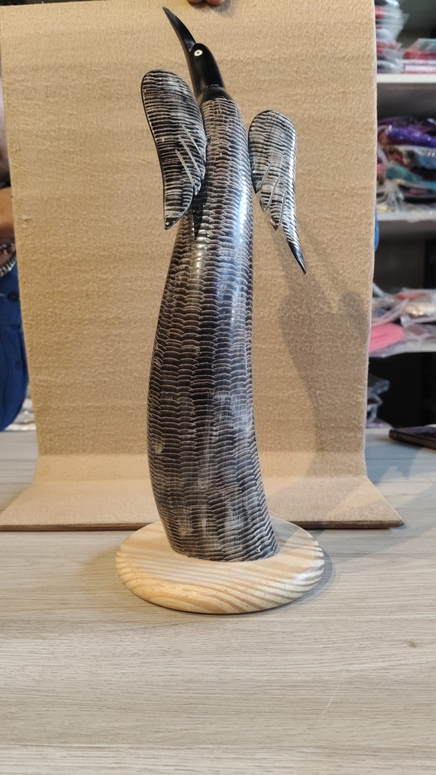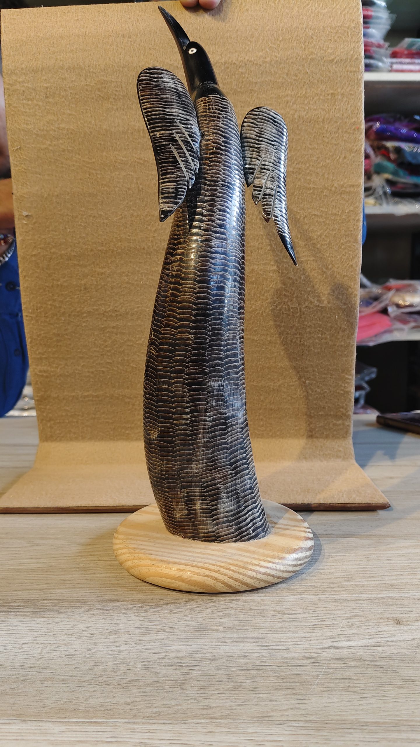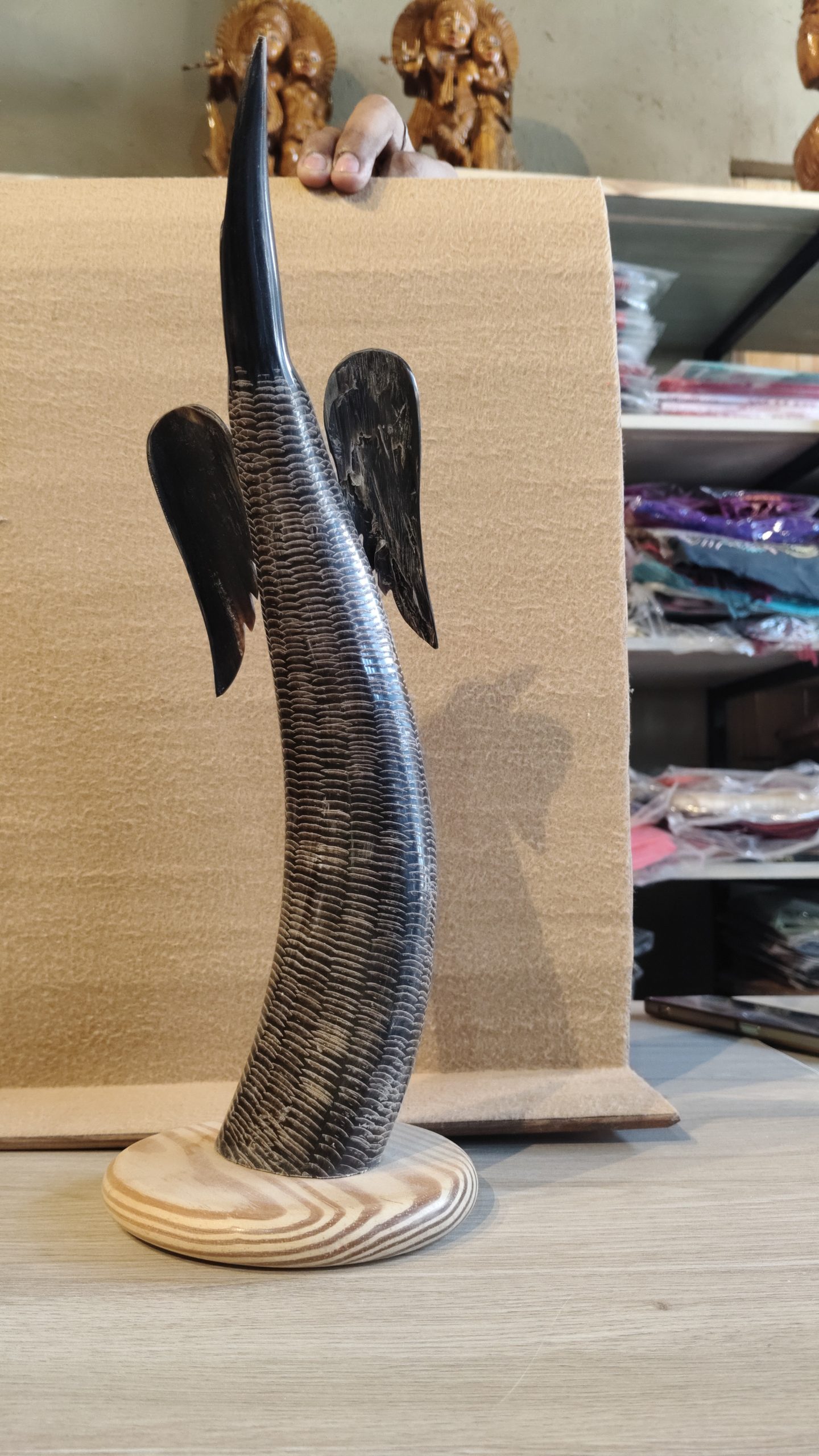 • Natural Materials: Made from a natural, dark, polished material (likely horn or a similar substance) and a light-colored wooden base.