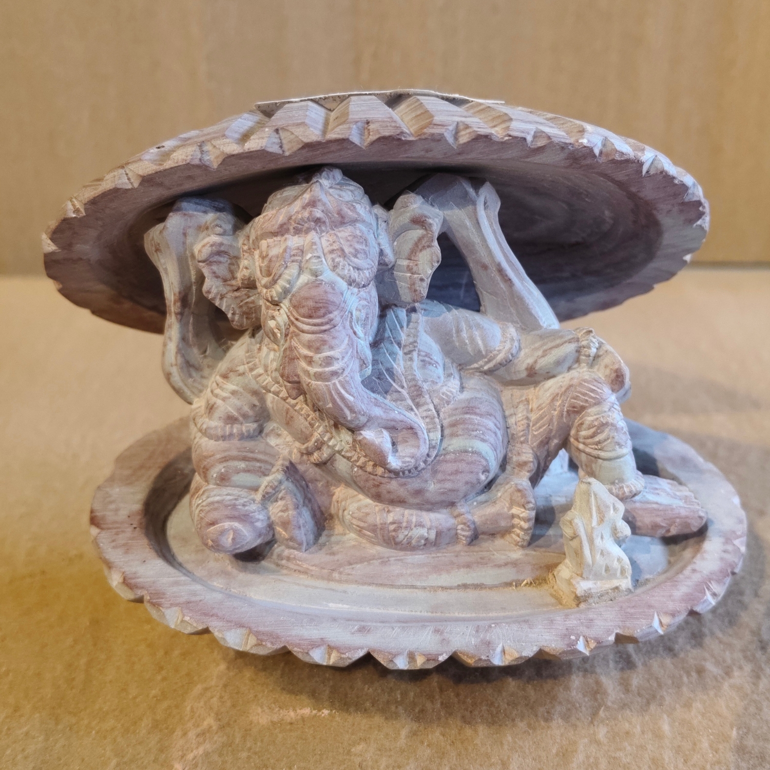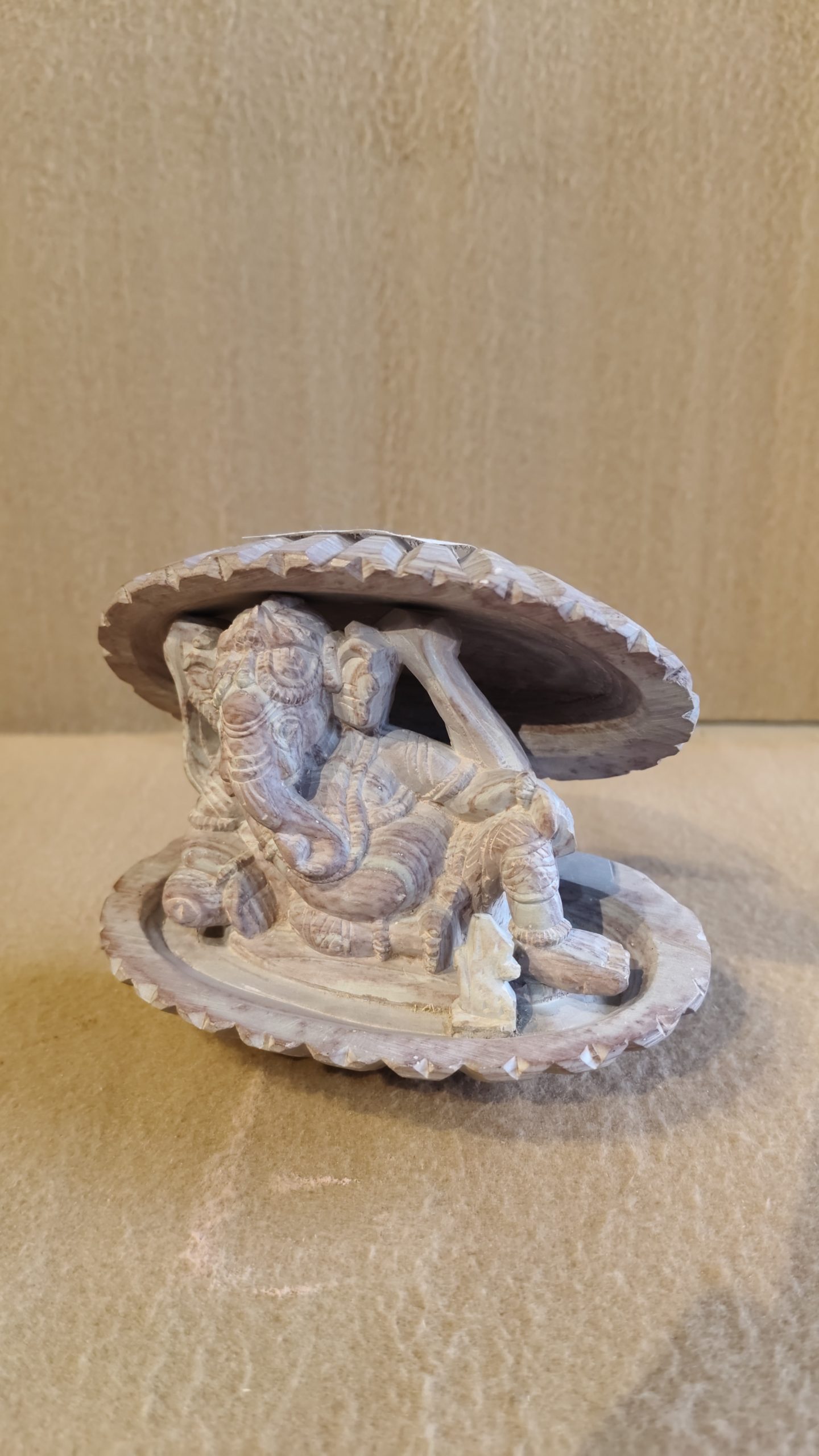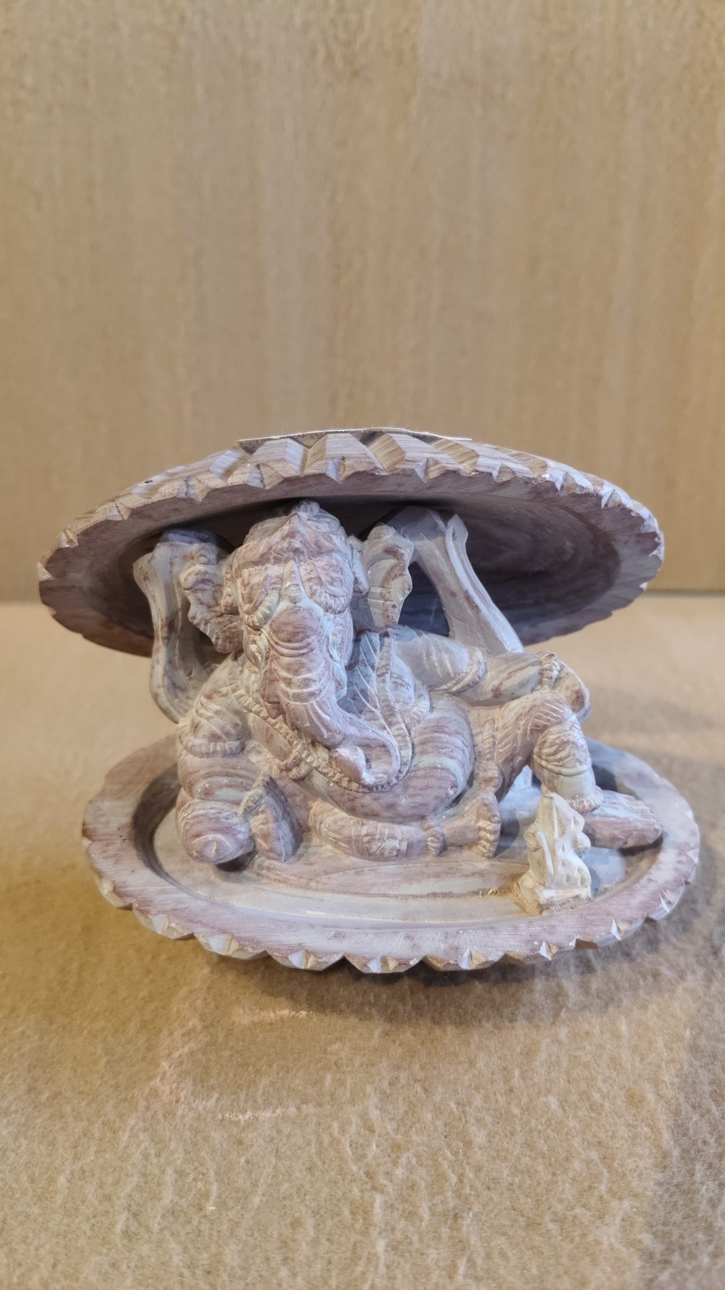 - Intricate Detail: The fine carving shows remarkable attention to detail in the figure of Ganesha and the surrounding shell.