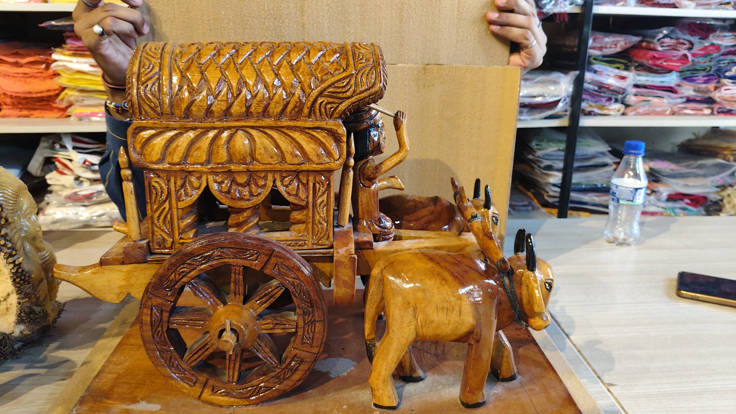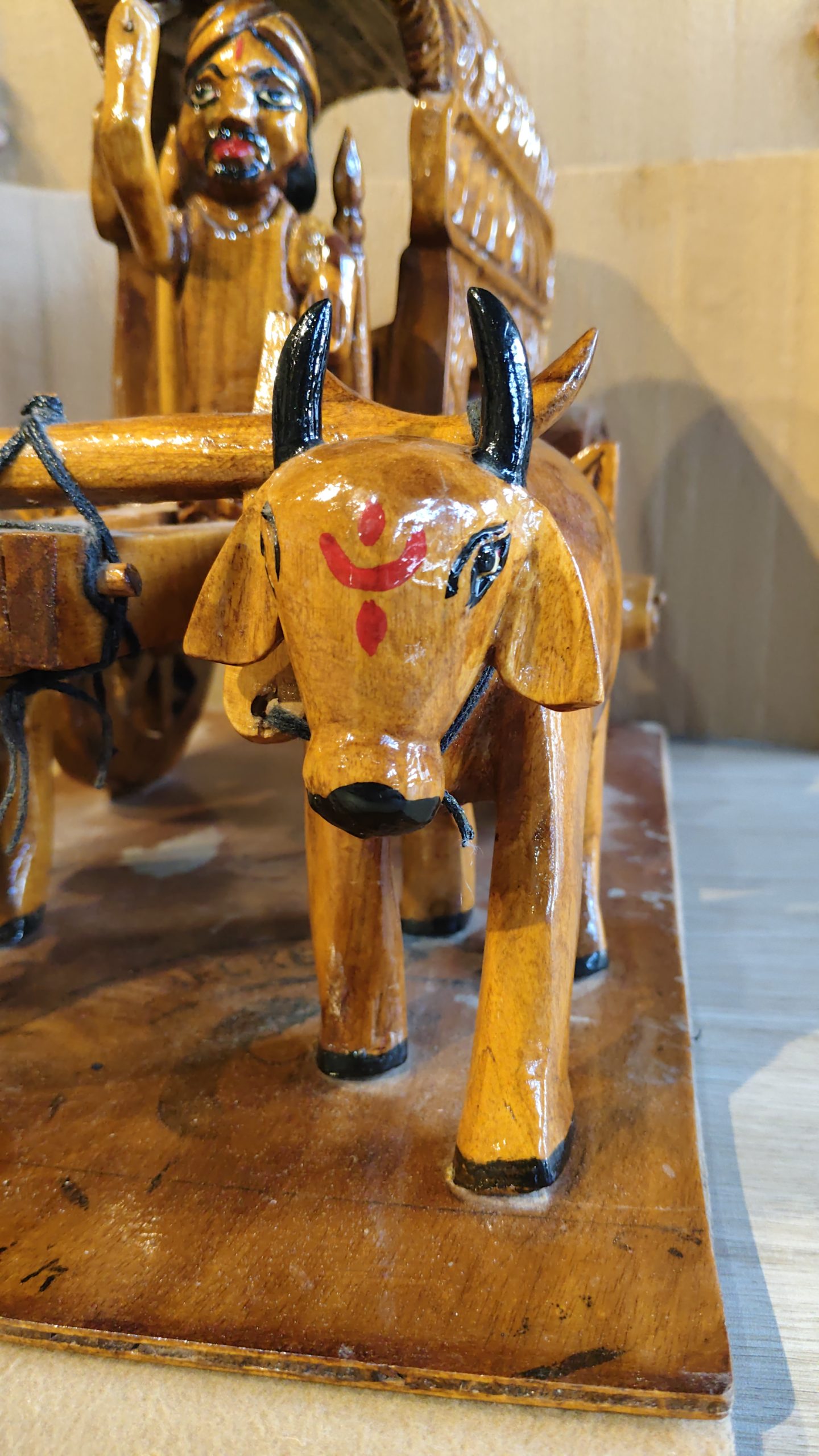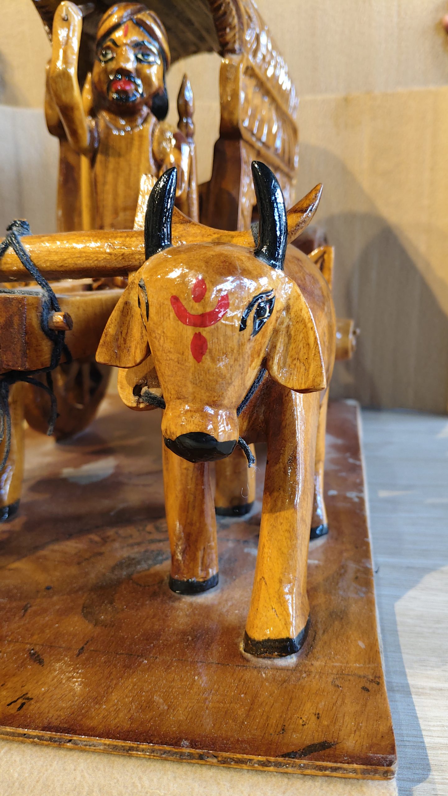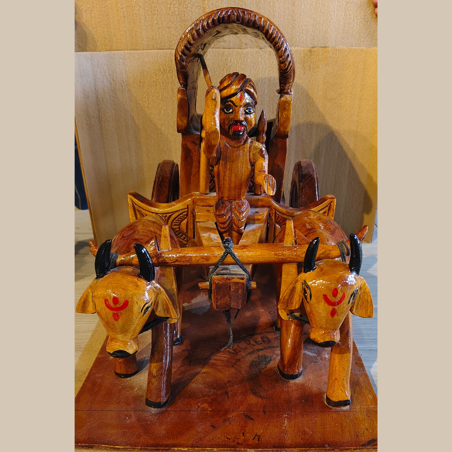 Hand-Carved Wooden Bullock Cart with Farmer Figurine