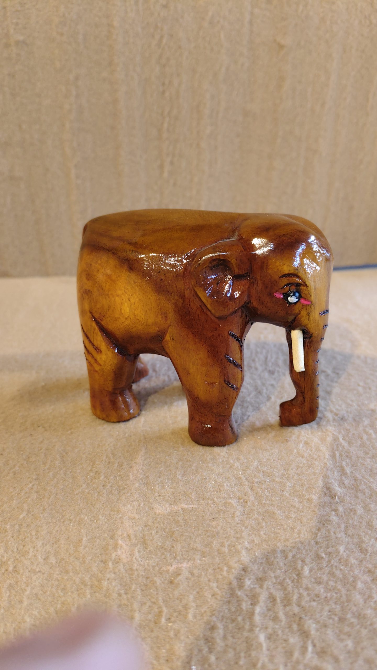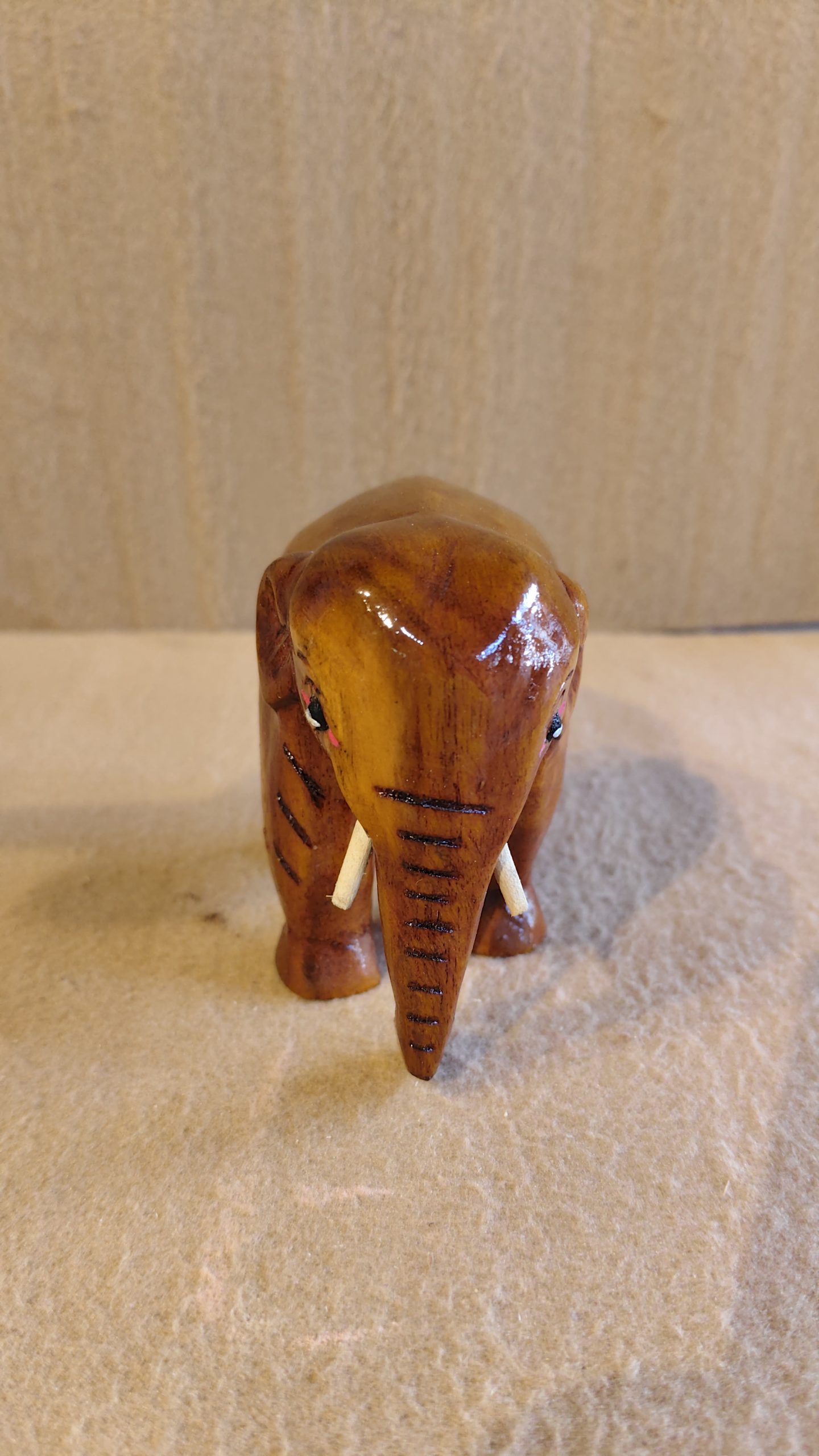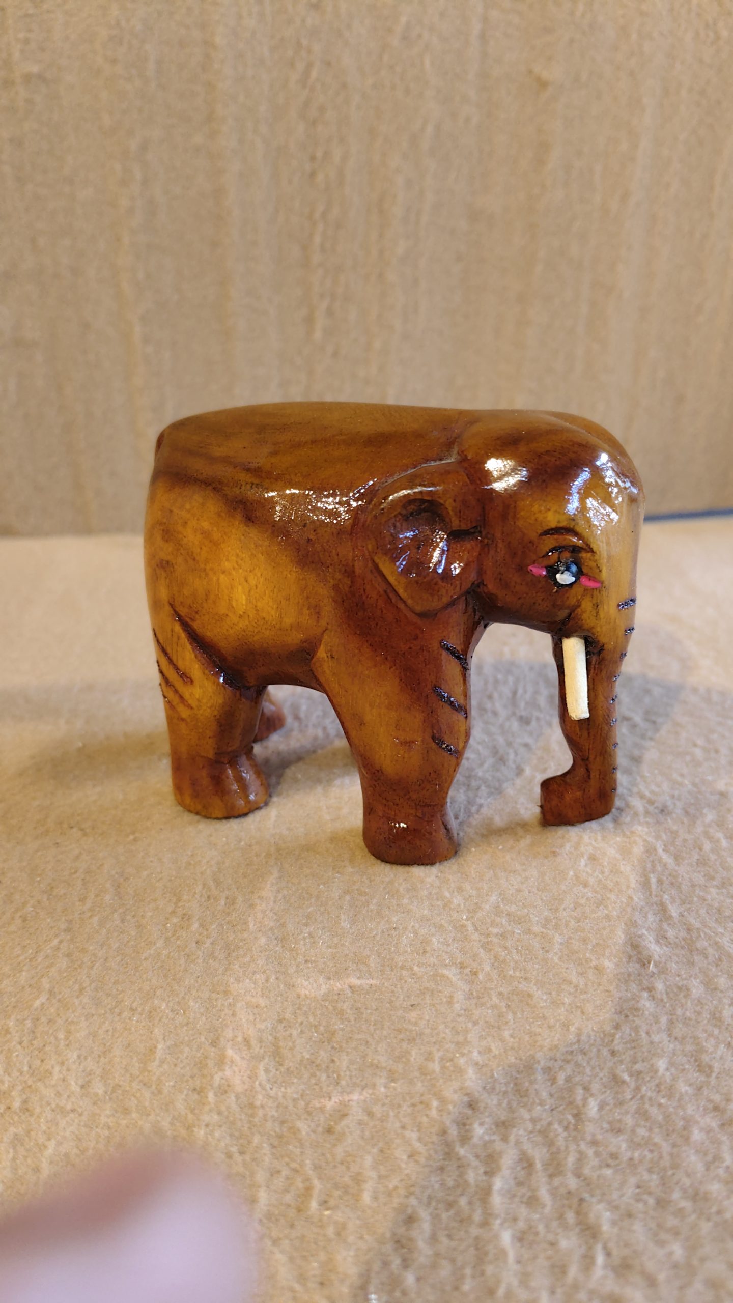 This small, handcrafted elephant figurine is a charming and whimsical piece of art. Carved from a single block of wood, its compact and rounded form gives it a friendly, almost cartoon-like appearance. The warm, rich grain of the wood is visible throughout, and a glossy lacquer finish gives the surface a beautiful, lustrous sheen.