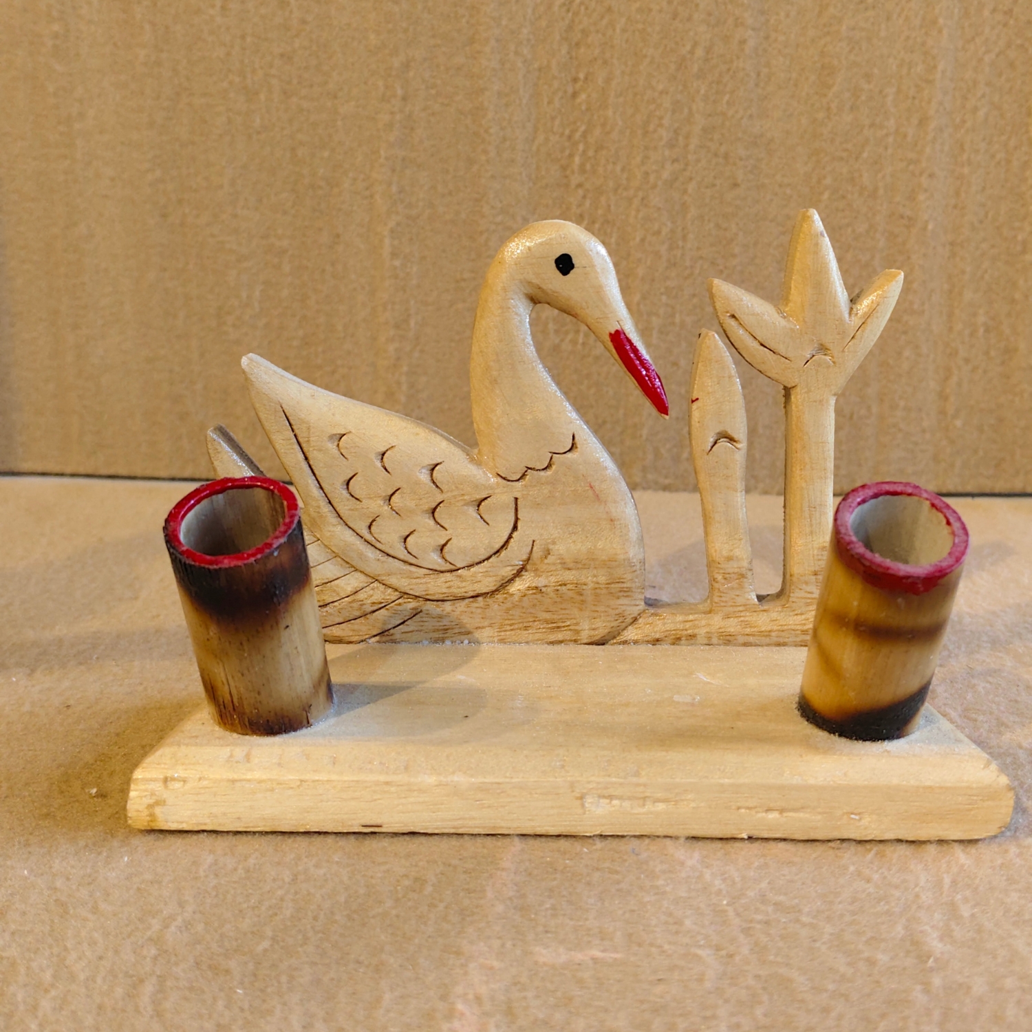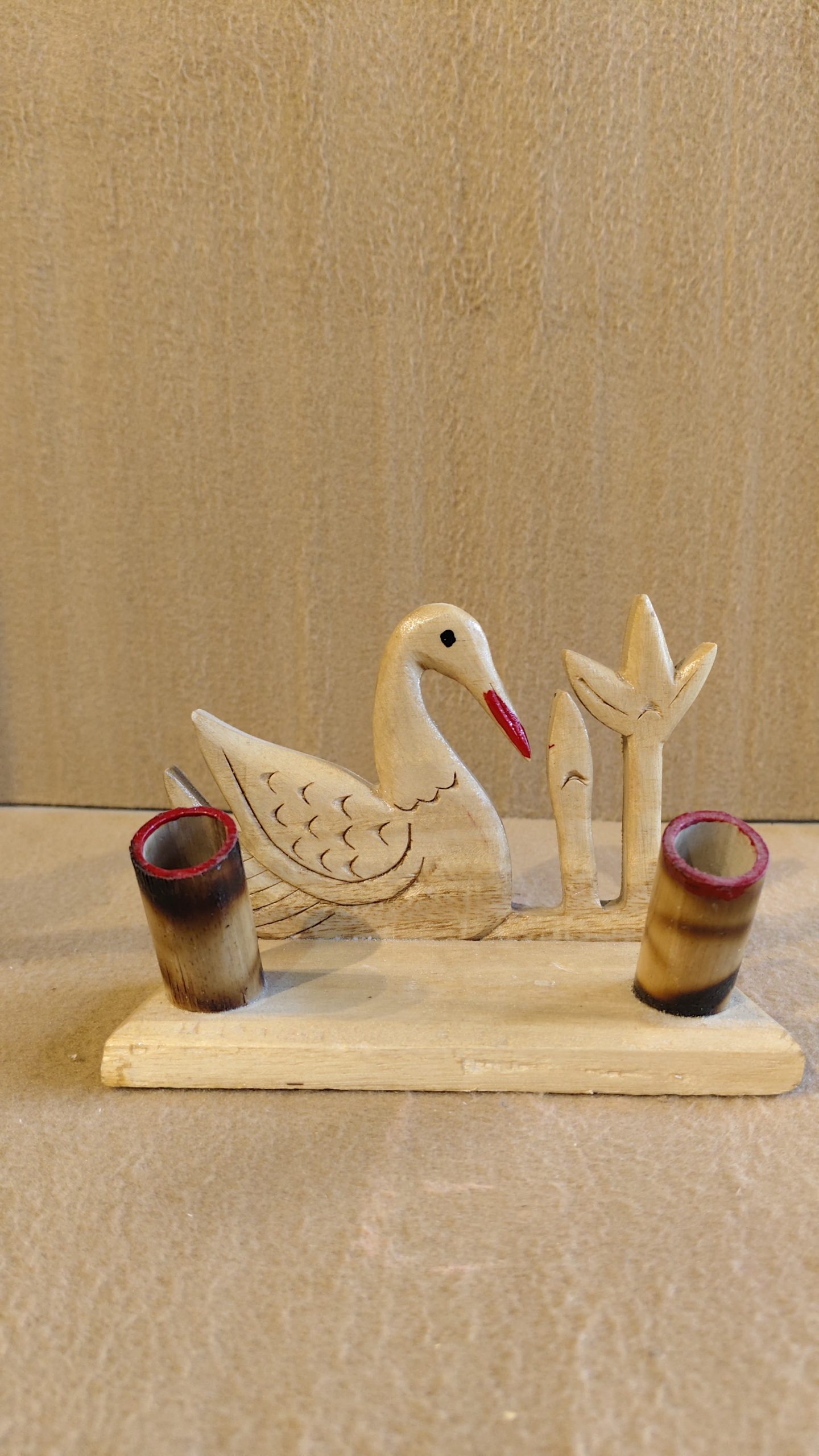 The swan is mounted on a sturdy, flat base, flanked by two small bamboo-like holders, perfect for organizing pens, pencils, or small stationery items. A small, stylized leaf adds a final, natural detail to the arrangement. This piece is a beautiful example of folk-art craftsmanship, combining functionality with artistic design. It’s a perfect gift for anyone who appreciates unique, handcrafted items and wants to add a personal touch to their desk or office.