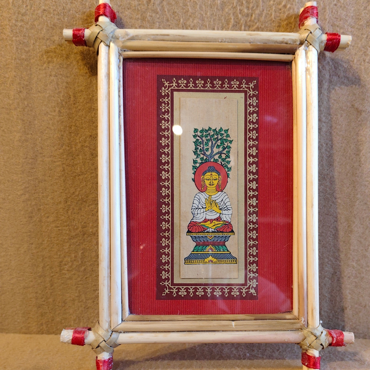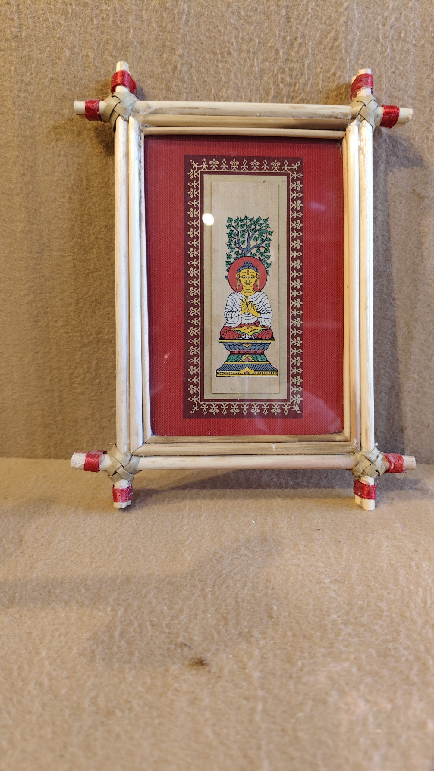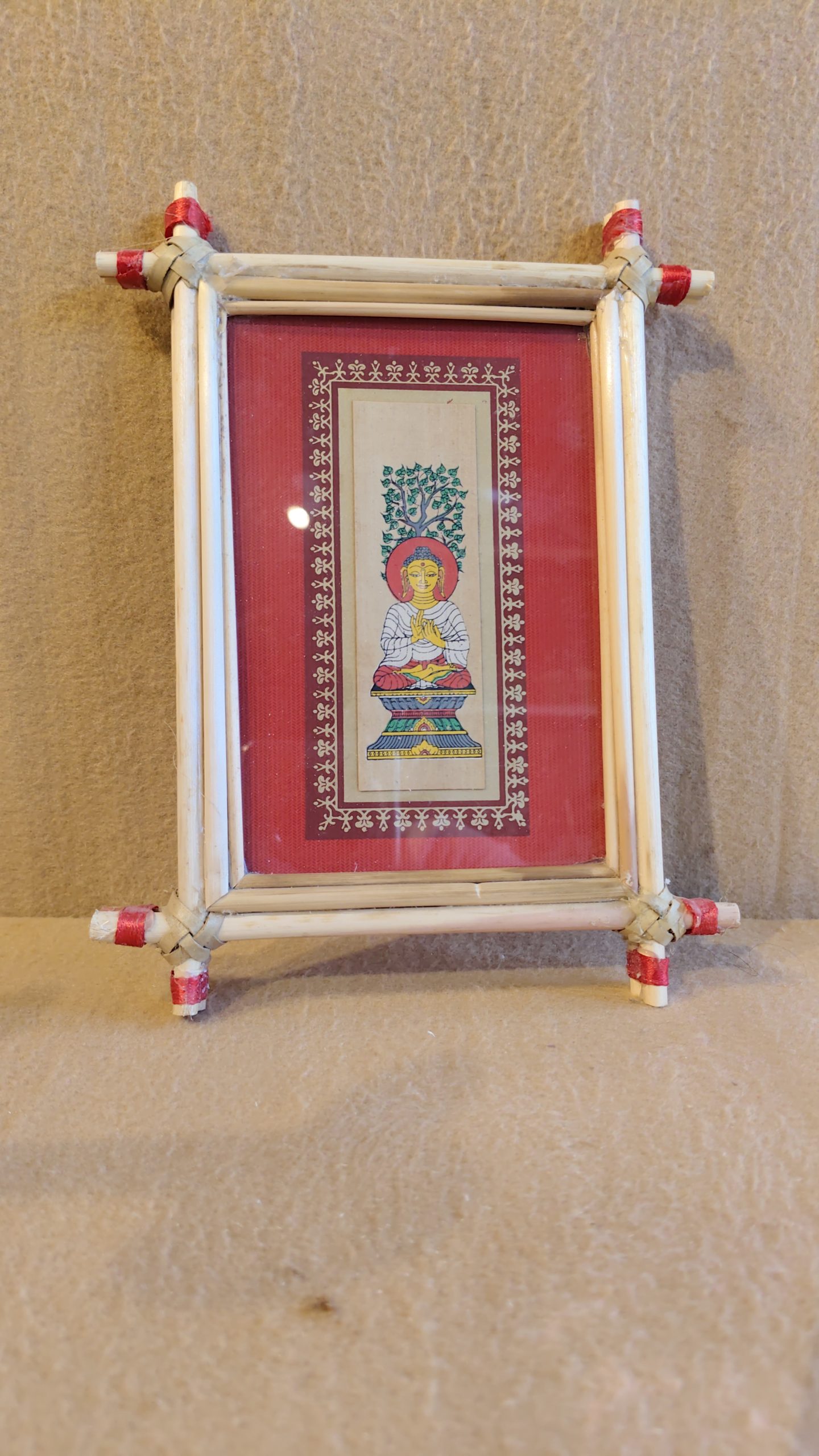 The artwork is set against a vibrant red background and is framed by a handcrafted bamboo frame. The frame is made of light-colored, thin bamboo sticks bound together at the corners with red and white string, giving it a rustic and authentic folk-art feel. This framed art is a perfect blend of peaceful symbolism and simple, elegant craftsmanship. It’s an ideal decorative item to add a touch of serenity and tradition to a wall, a meditation space, or a desk.