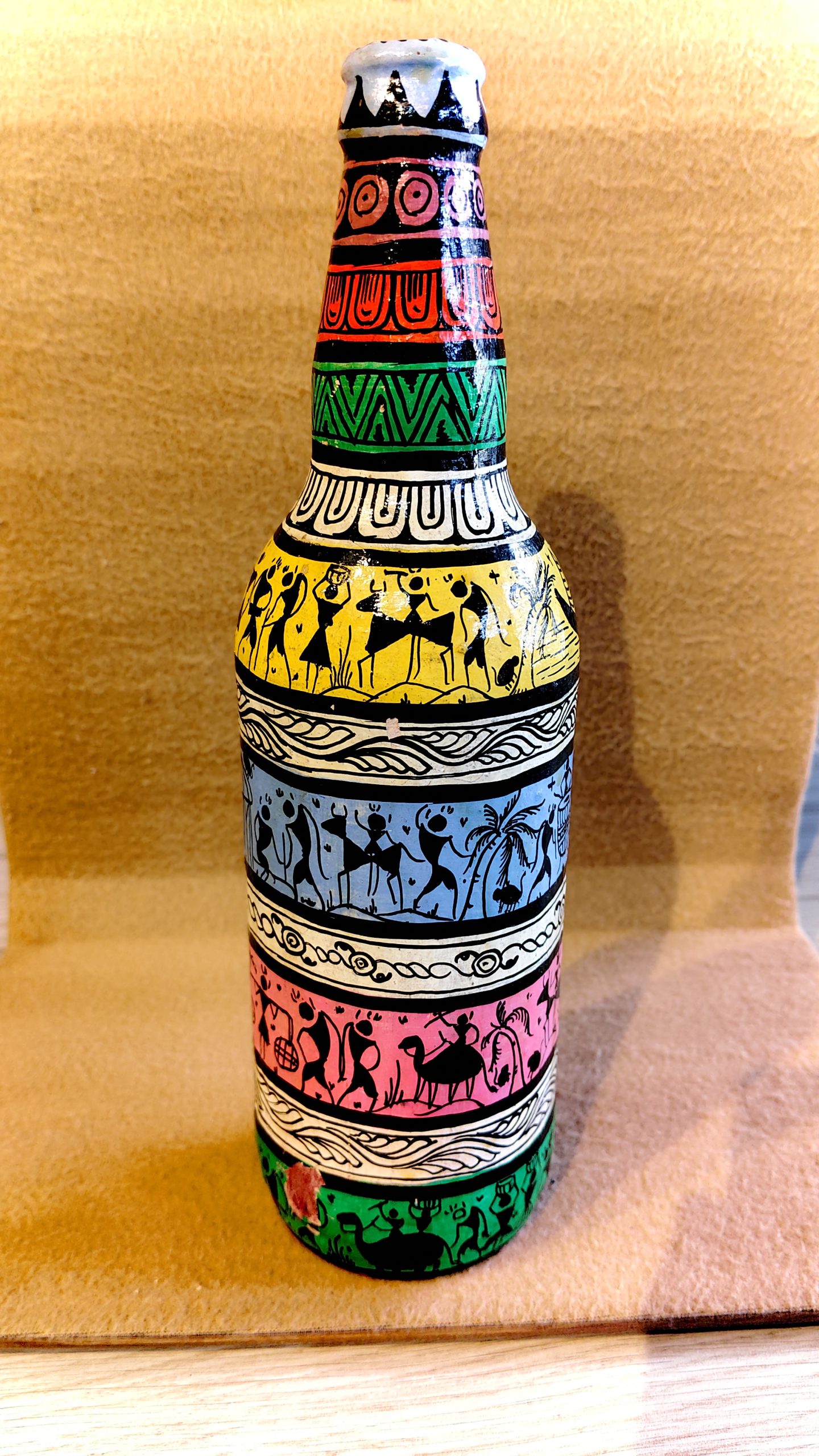 Hand-Painted Decorative Bottle – Tribal Warli Art Theme
