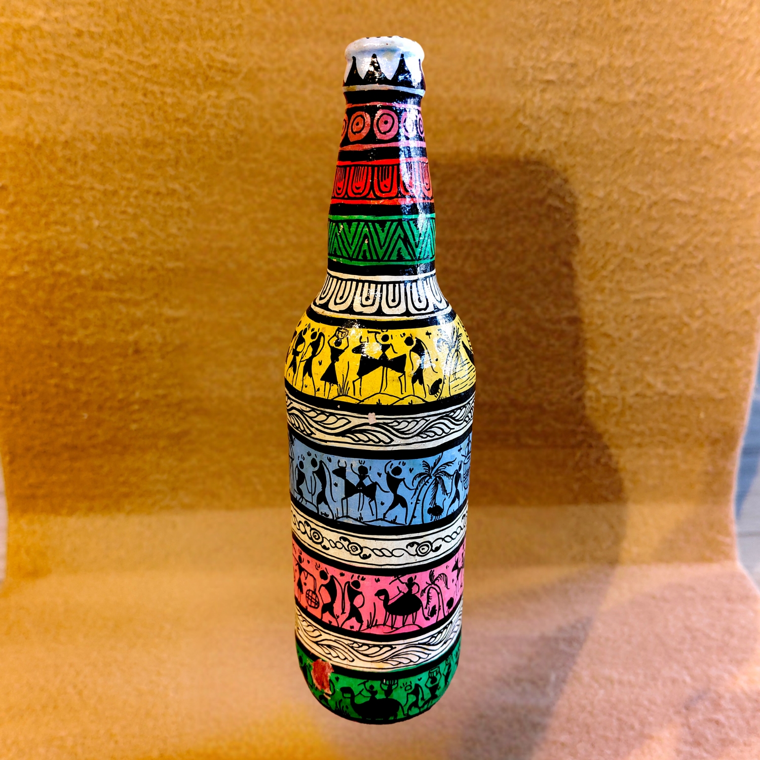 Bring the essence of rural India into your living space with this Hand-Painted Decorative Bottle, beautifully adorned with traditional Warli tribal art. This upcycled glass bottle is transformed into a vibrant piece of folk art, featuring colorful bands of storytelling scenes depicting village life, music, dance, animals, and nature – all hand-painted with meticulous detail.
