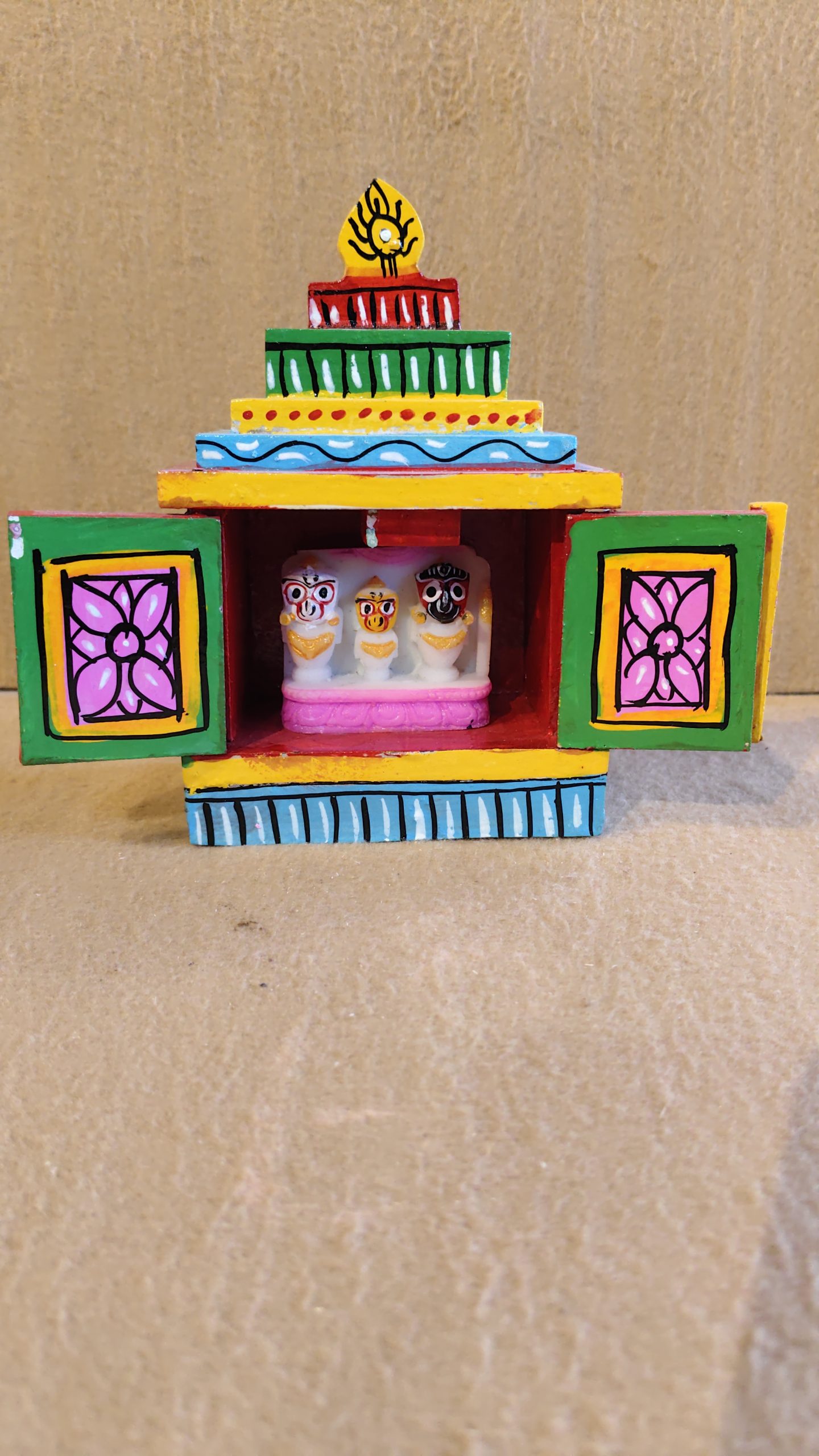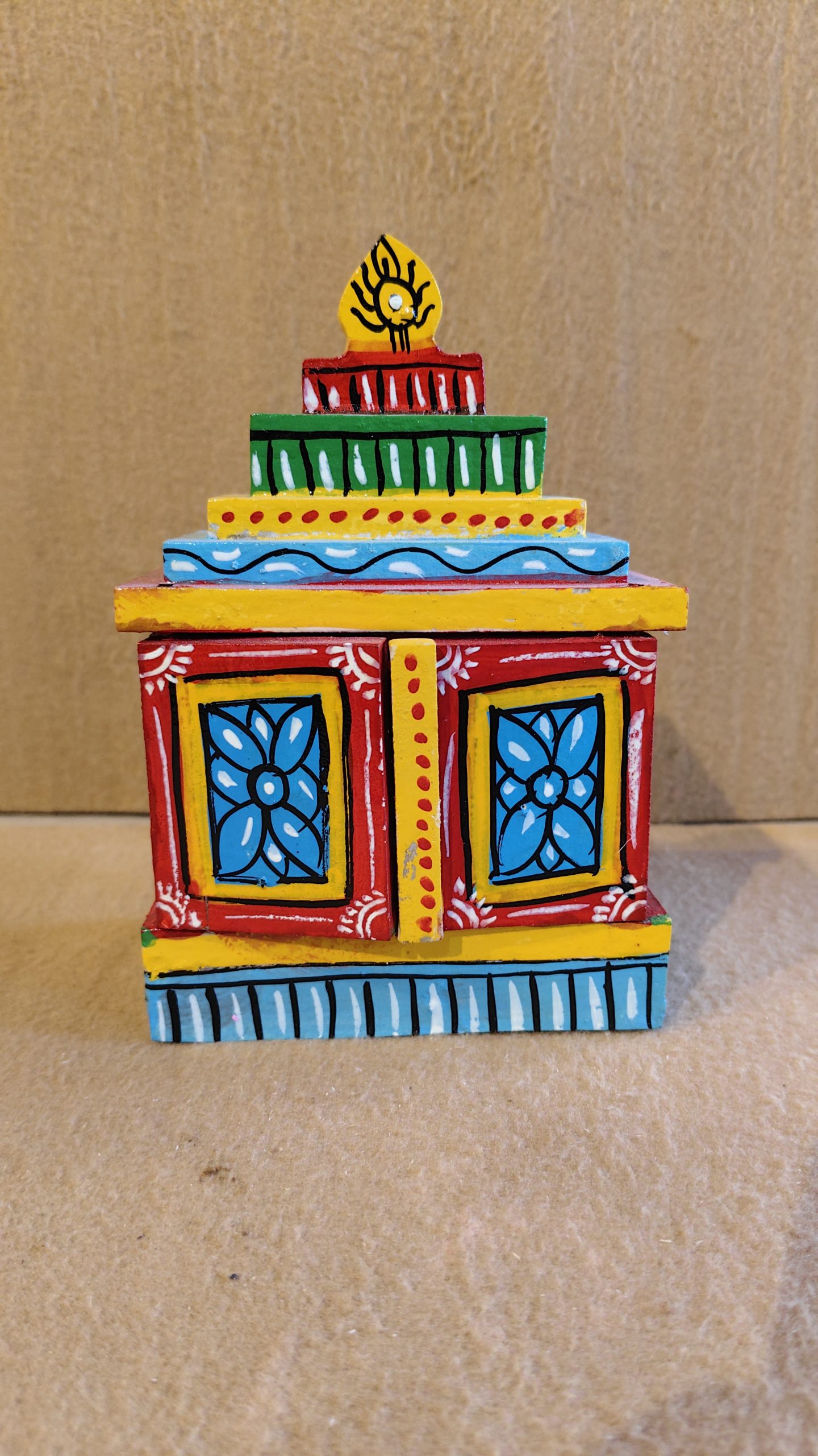 The base is a bright blue with white stripes, supporting a square body with two red doors. These doors are painted with beautiful, blue floral motifs framed in yellow, while the space between them is decorated with a line of red dots. The tiered roof is a cascade of colors, from yellow and blue to green and red, each with its own unique design. A small finial with a symbol of a flame or sun rests on top, adding a final spiritual touch. This piece is a perfect blend of traditional religious architecture and lively folk-art design, making it a wonderful decorative item for a home altar, a desk, or a display shelf.