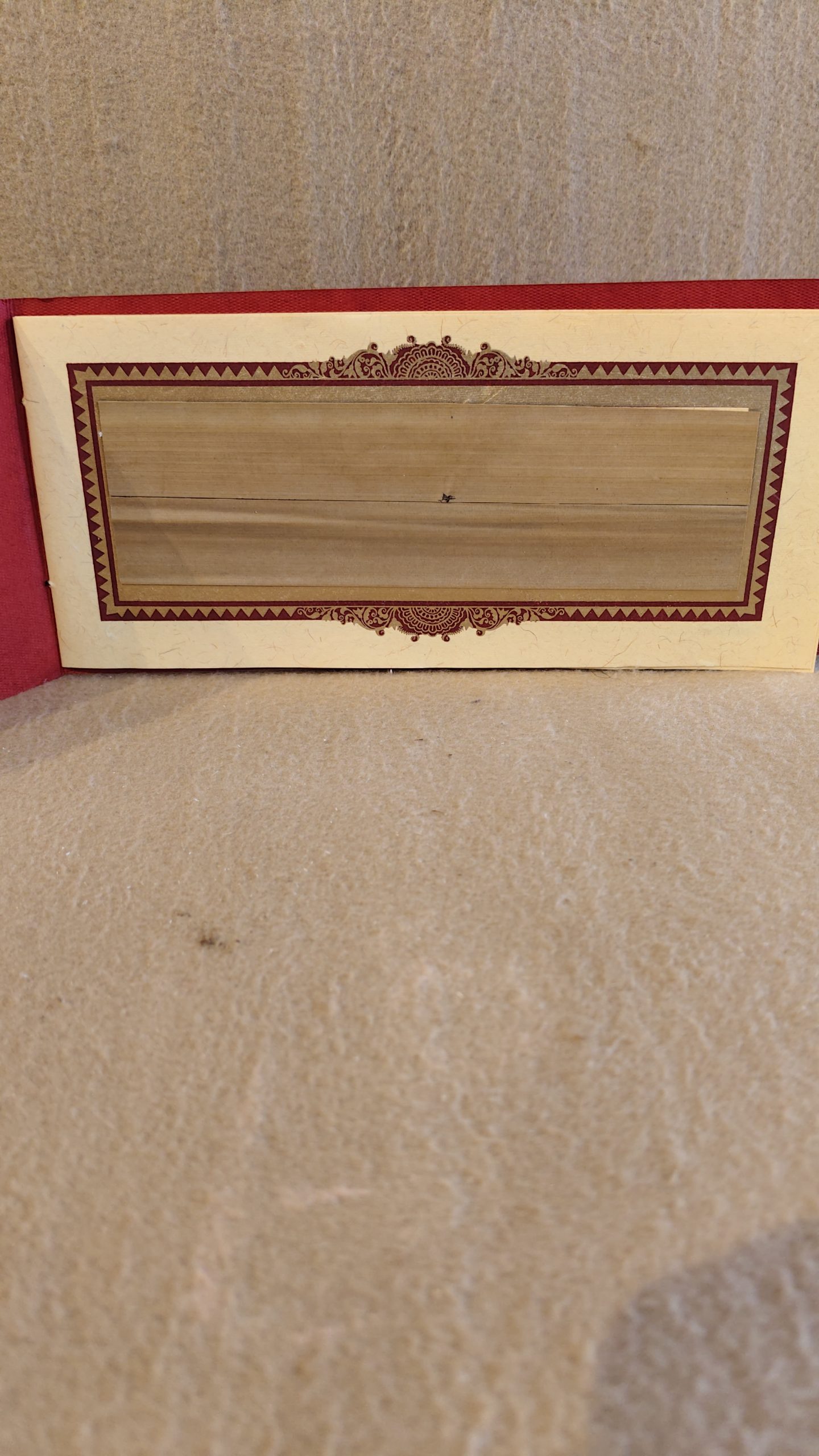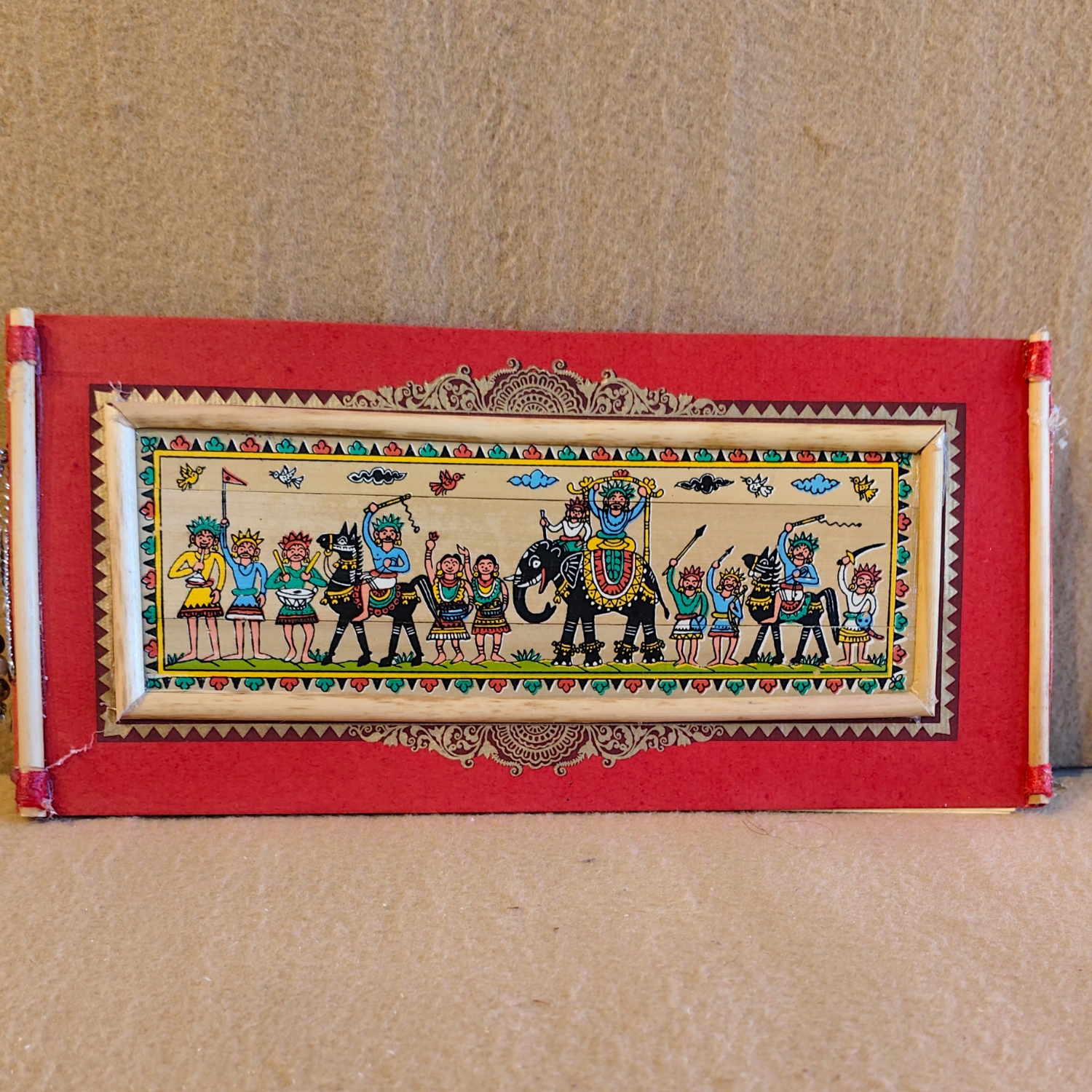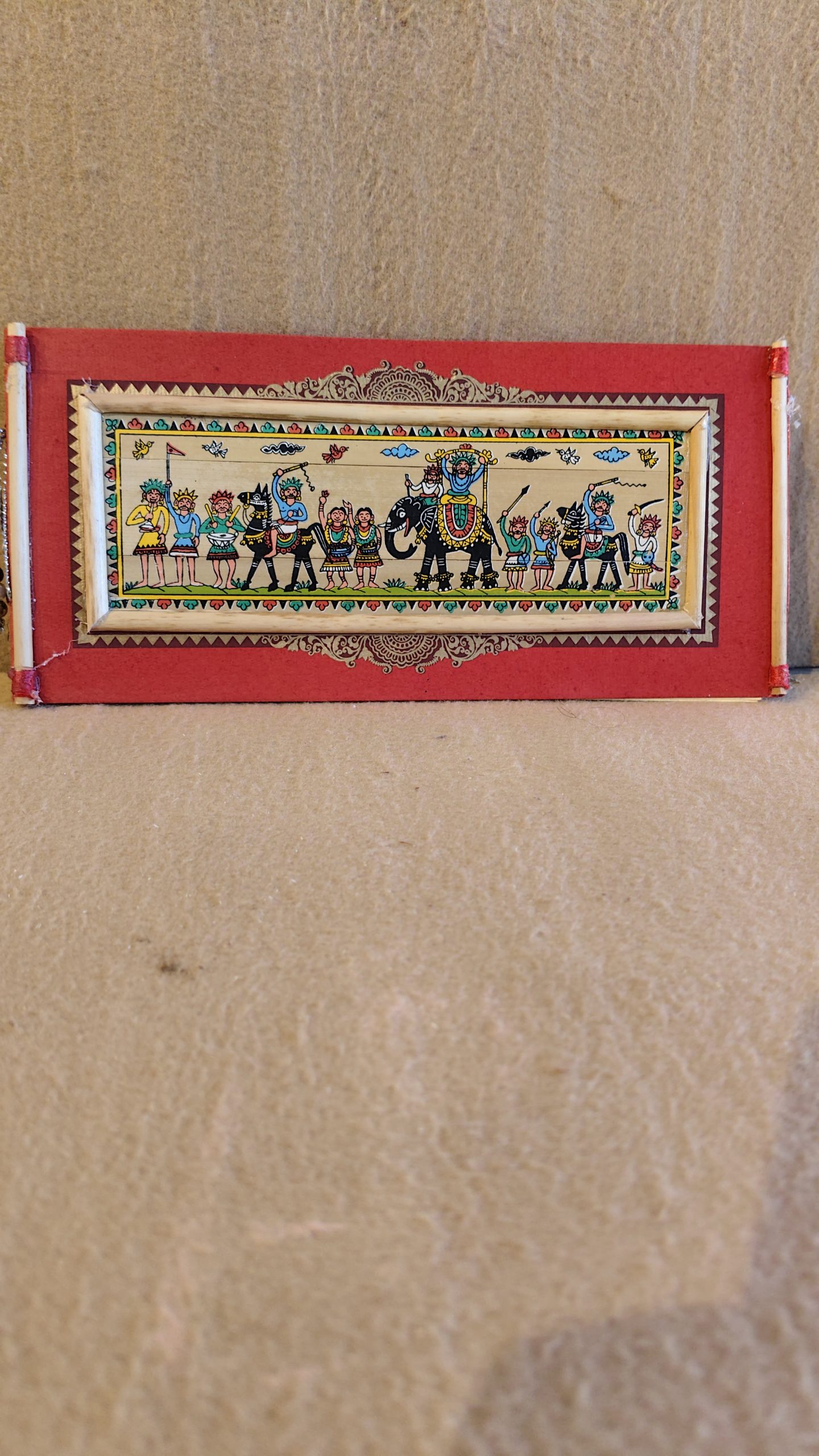 The painting is framed by a broad, vibrant red border with a subtle black and white pattern, which makes the detailed artwork stand out. The rustic frame is crafted from what appears to be thin bamboo or cane sticks, tied at the ends, giving it an authentic, handcrafted feel. This piece is a perfect blend of cultural storytelling and traditional artistry, making it a beautiful and meaningful addition to any home. It can be hung on a wall, placed on a shelf, or given as a unique gift that celebrates Indian heritage.