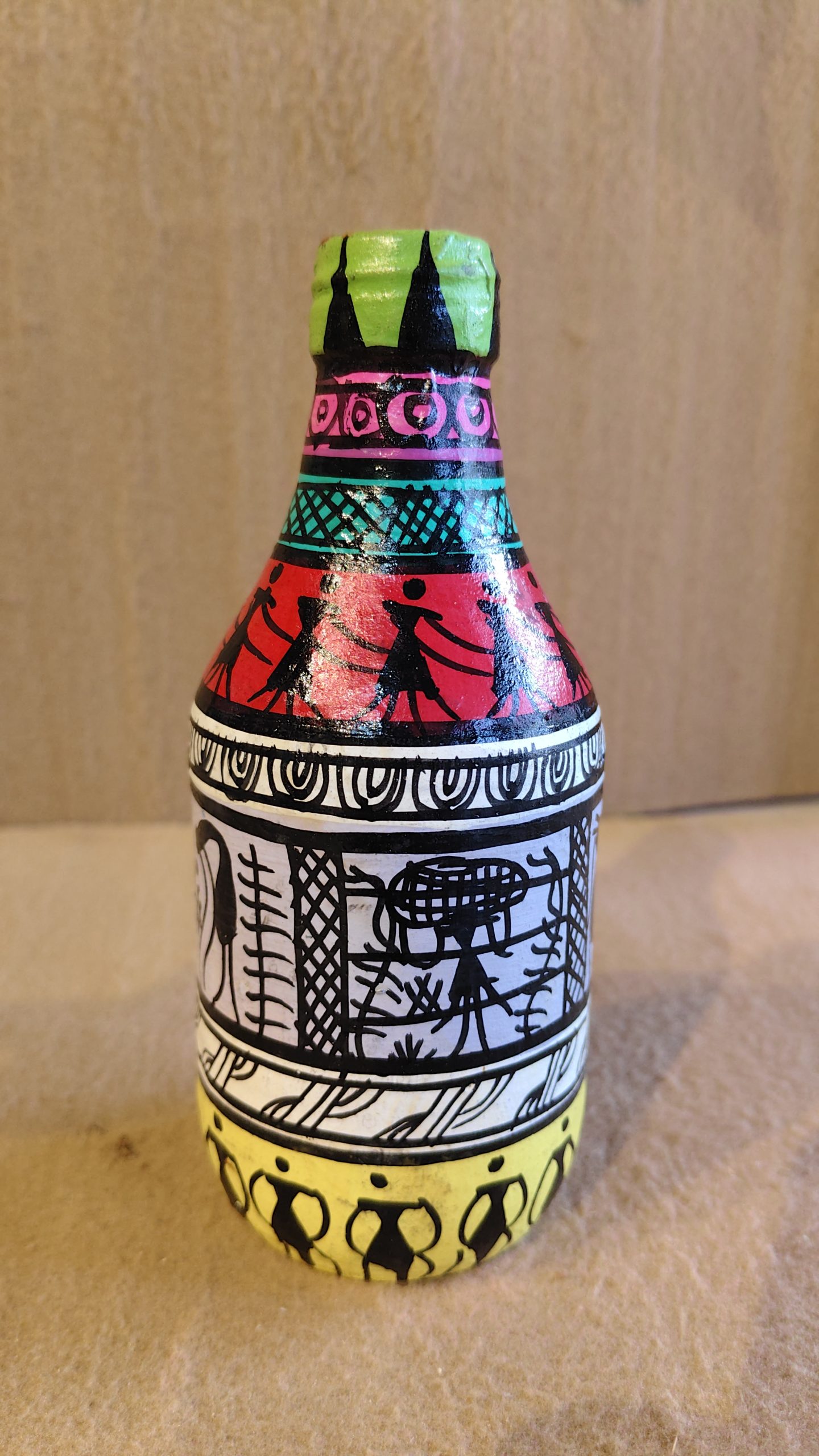 This vibrant, hand-painted decorative bottle is a captivating piece of folk art. It transforms a simple bottle into a multi-layered canvas of traditional Warli painting and other geometric patterns.