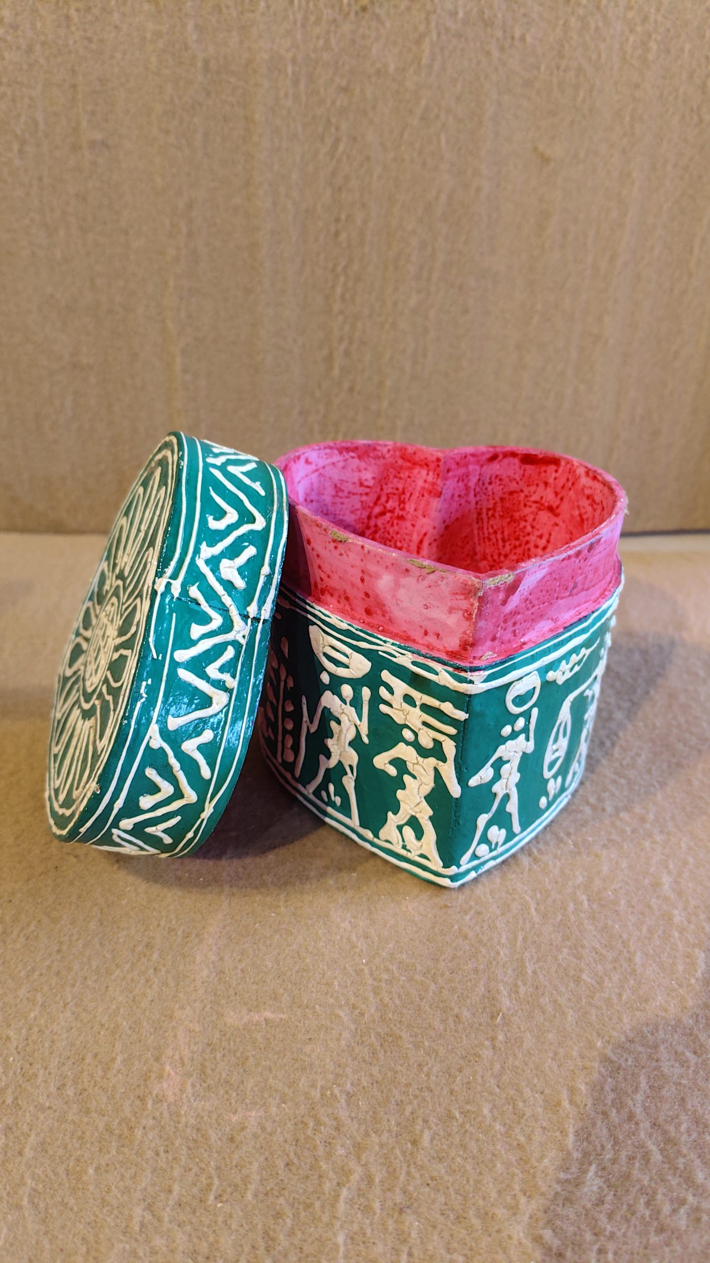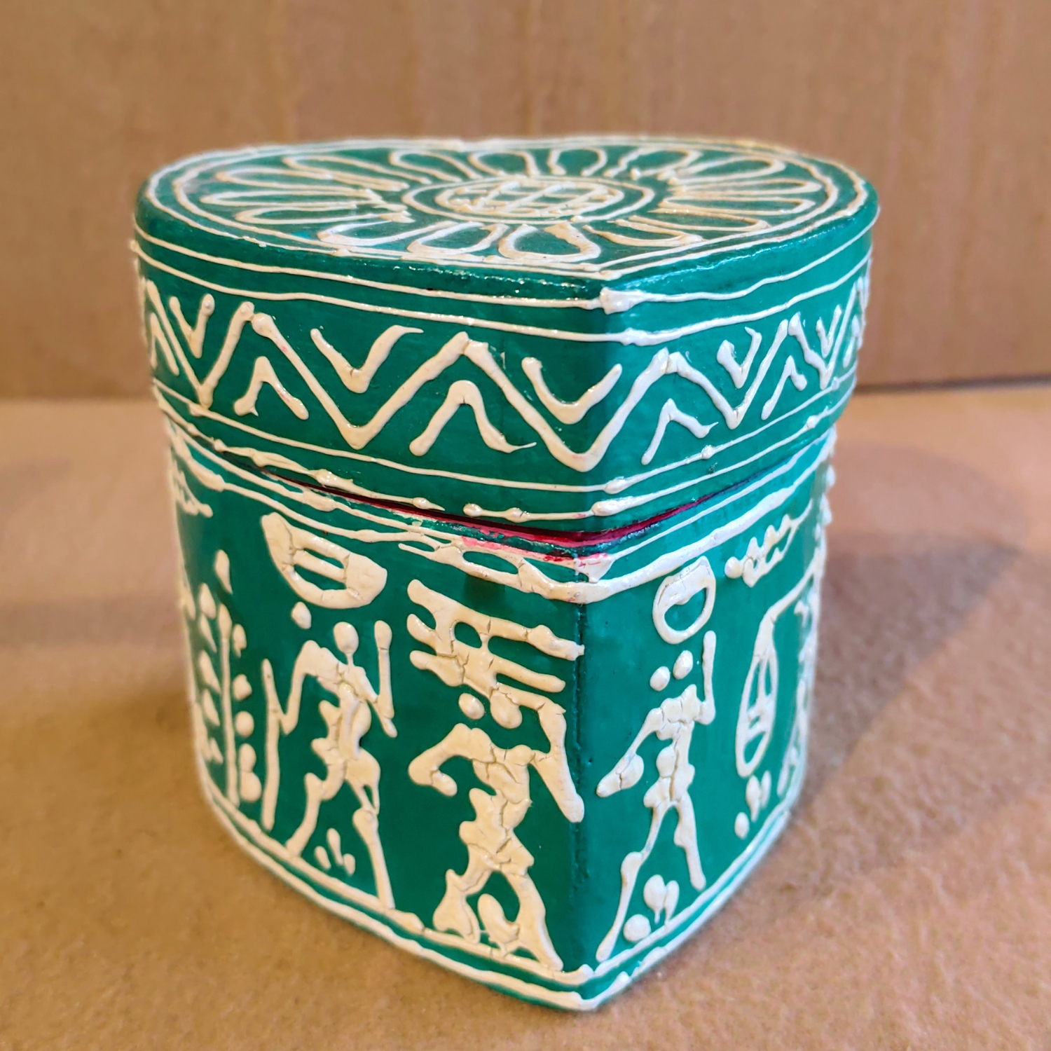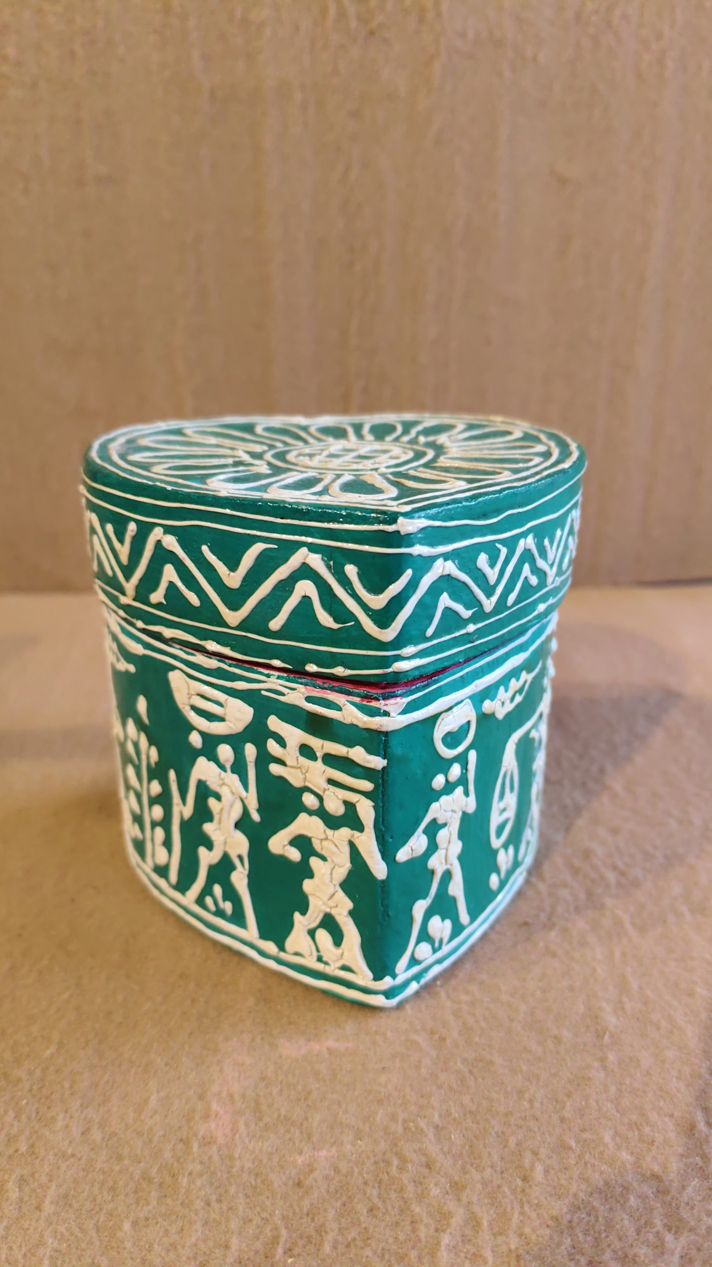 The design is a beautiful interpretation of traditional Warli art, a tribal art form from India known for its simple, geometric figures that tell stories of daily life. The sides of the box are adorned with lively scenes of figures engaged in activities, while the lid features a beautiful circular, floral, or sun-like motif. The raised texture of the white paint adds a tactile element to the box. The simple design and vivid color make it a versatile item, perfect for storing small trinkets, jewelry, or simply as a decorative accent on a shelf or desk.