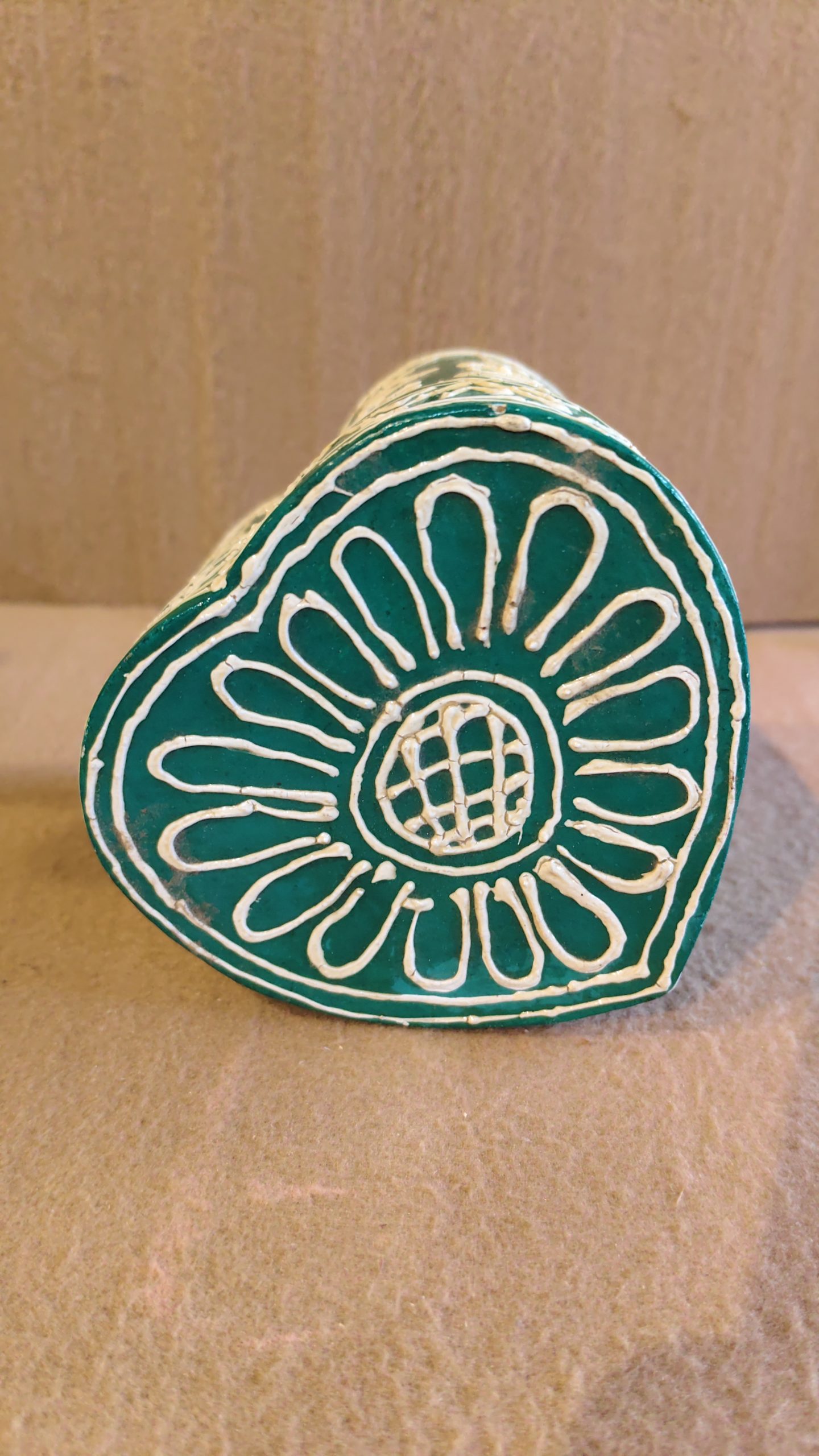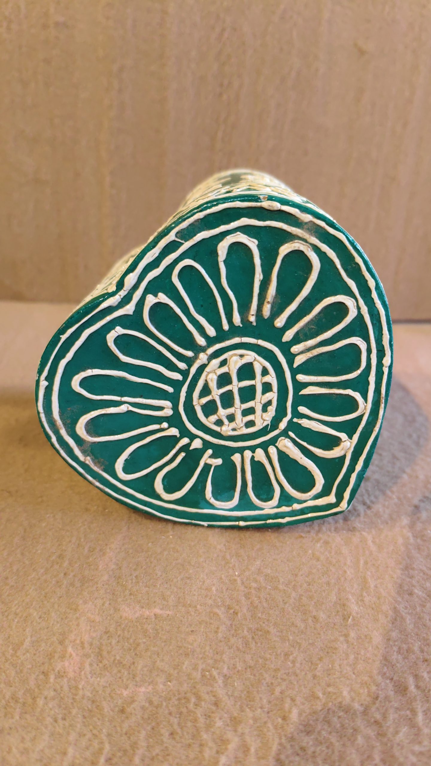 This unique, hand-painted decorative box is a charming piece of folk art. It features a triangular shape with rounded corners and a removable lid. The box is painted in a vibrant teal green and is intricately decorated with a raised, white painted design.