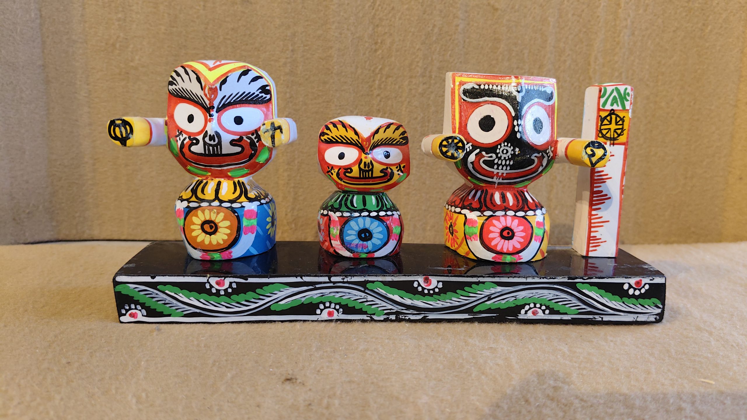 This charming, hand-painted wooden set is a traditional and artistic representation of the deities from the Jagannath Temple in Puri, Odisha, India. The set includes the three revered idols: Lord Jagannath, his brother Lord Balabhadra, and his sister Goddess Subhadra, along with the Sudarshana Chakra. Each figure is uniquely hand-painted with a vibrant array of colors and patterns, reflecting the traditional folk-art style of the region.