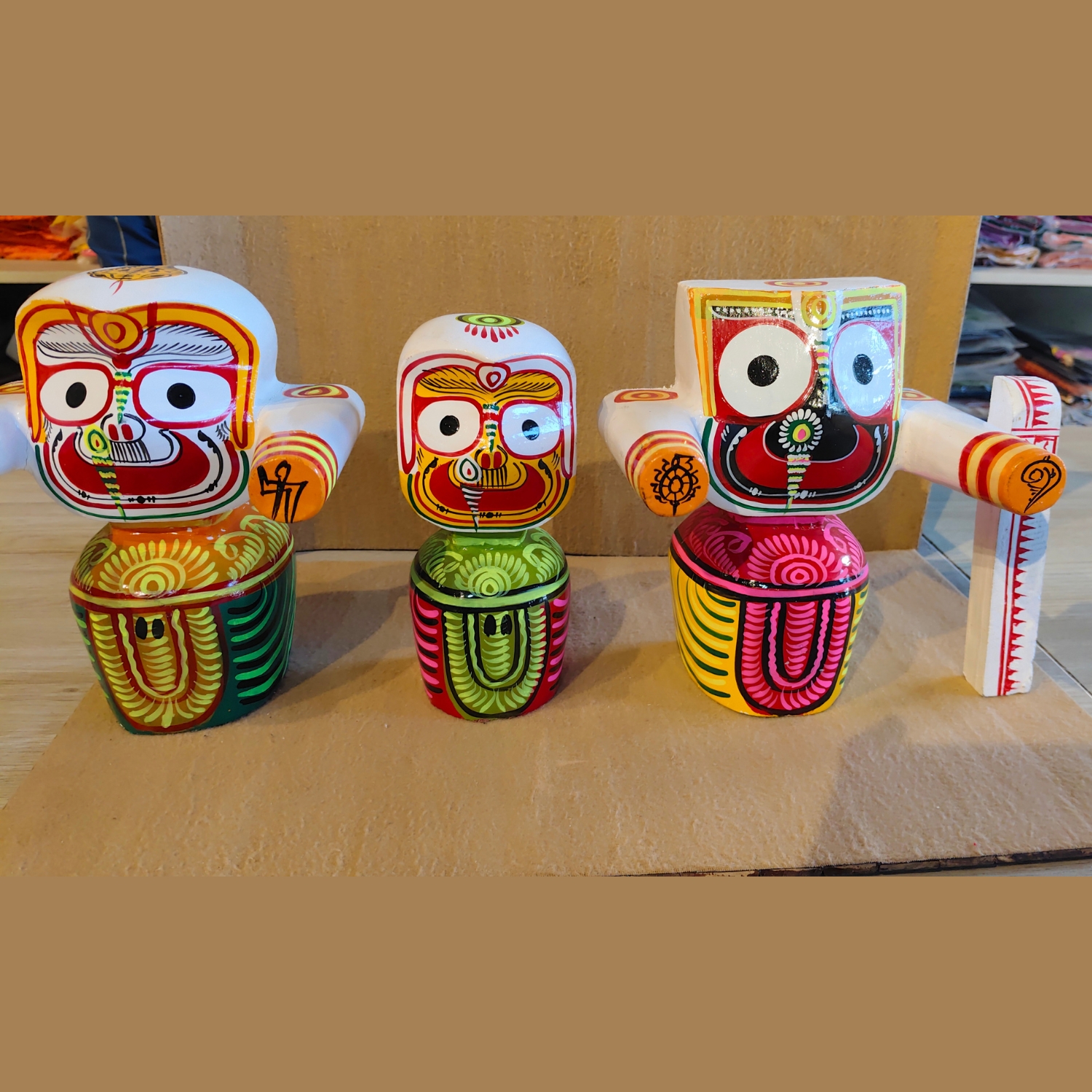 This charming, hand-painted wooden set is a traditional and artistic representation of the deities from the Jagannath Temple in Puri, Odisha, India. The set includes the three revered idols: Lord Jagannath, his brother Lord Balabhadra, and his sister Goddess Subhadra, along with the Sudarshana Chakra. Each figure is uniquely hand-painted with a vibrant array of colors and intricate patterns, reflecting the traditional folk-art style of the region.