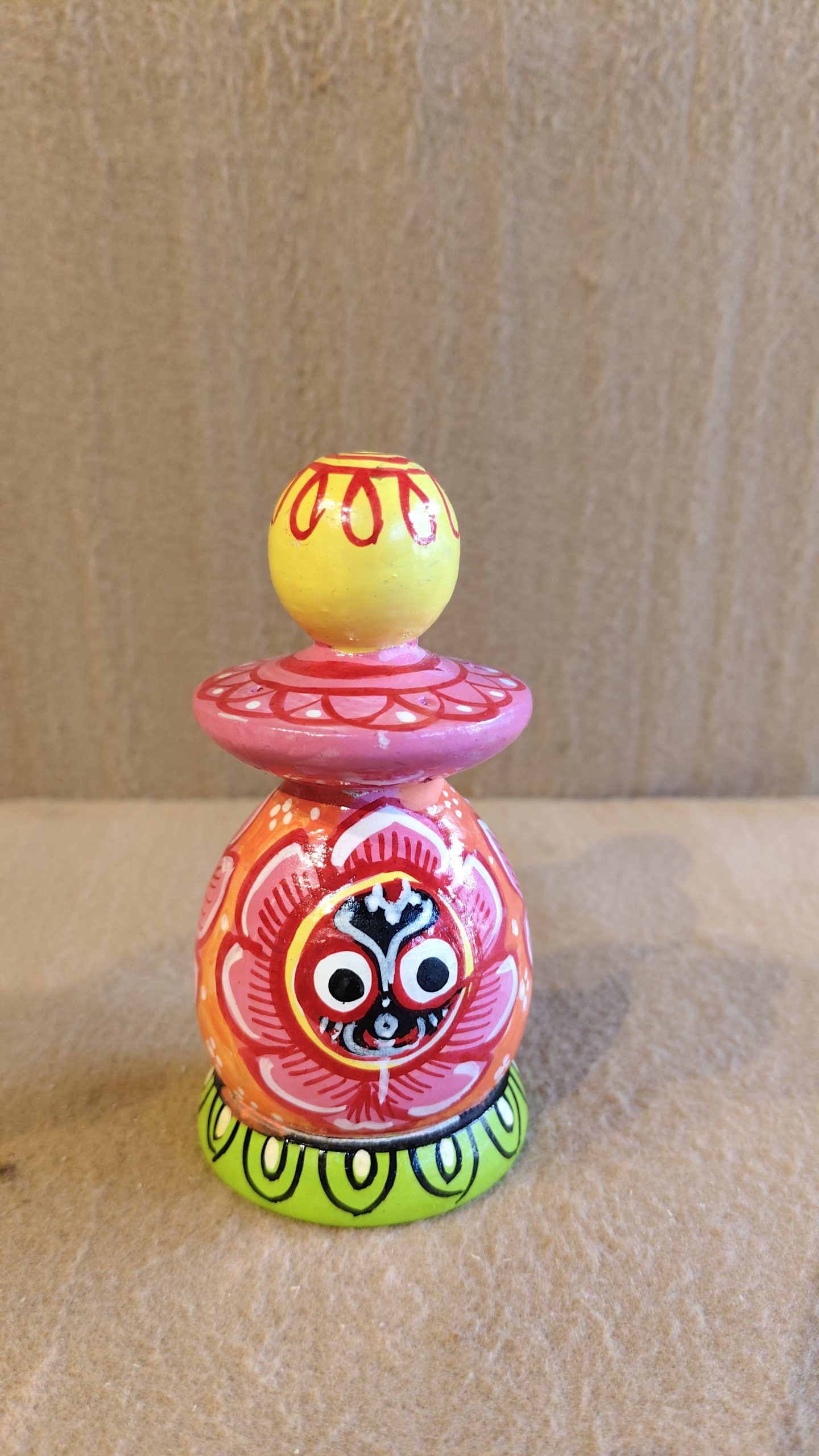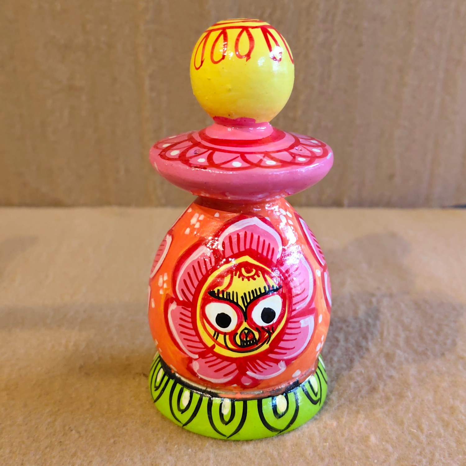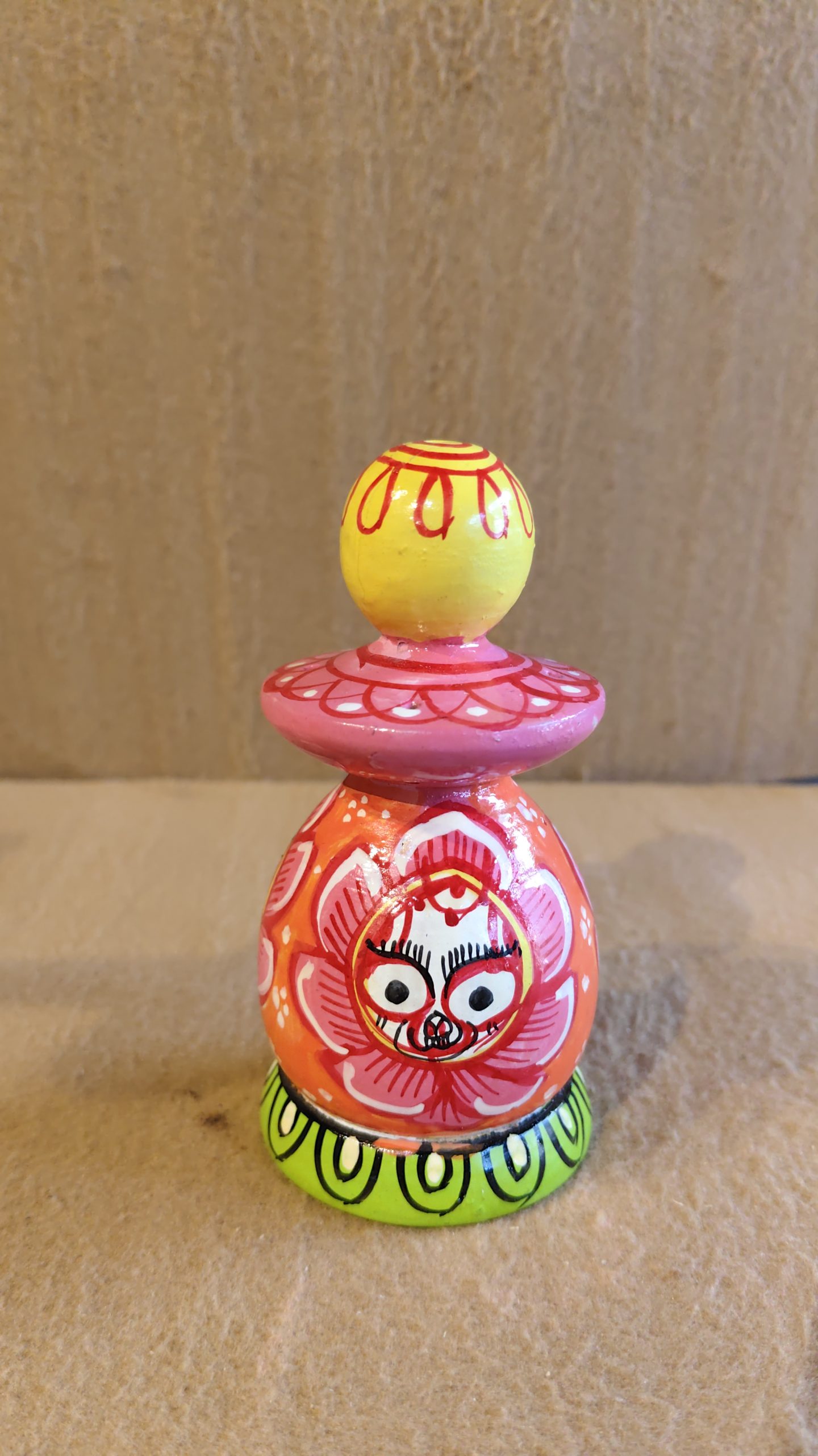 This charming, hand-painted wooden figurine is a unique and stylized representation of Lord Jagannath, a revered deity in Hinduism. The idol is crafted in a simplified, modern folk-art style, with a bold and vibrant color palette. The central body of the figure is a bright orange, decorated with a large, stylized lotus flower in pink and red. Within the flower is the iconic face of Jagannath, with his large, round eyes, a distinctive feature of the idols found at the Jagannath Temple in Puri, Odisha.