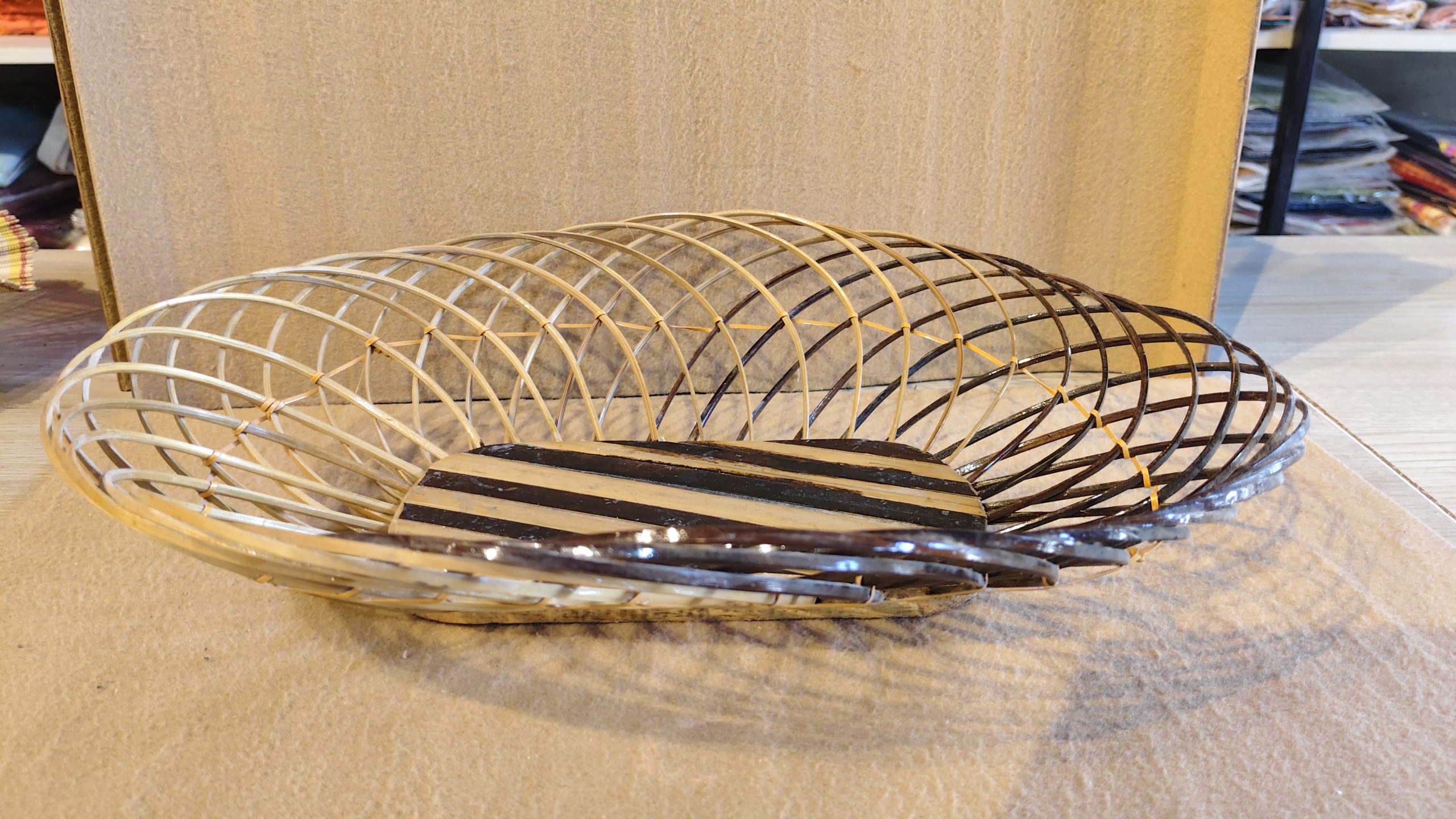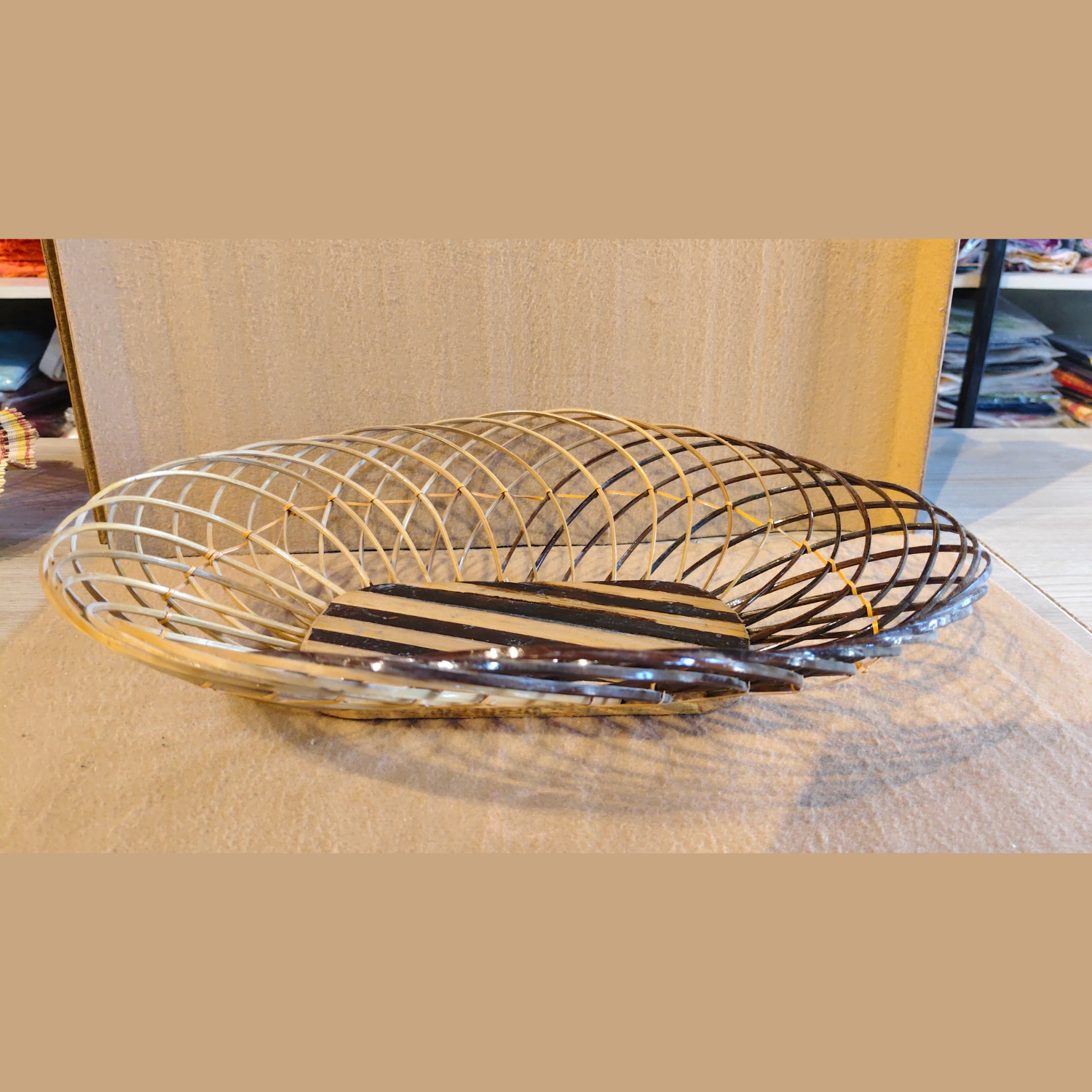 This elegant, hand-woven decorative bowl is a beautiful example of traditional craftsmanship and the natural beauty of sustainable materials. The bowl has a unique, flattened oval shape, with an open, airy structure created by a series of thin bamboo or cane sticks woven together. The weaving technique features a spiral pattern that creates a sense of dynamic movement and visual interest.