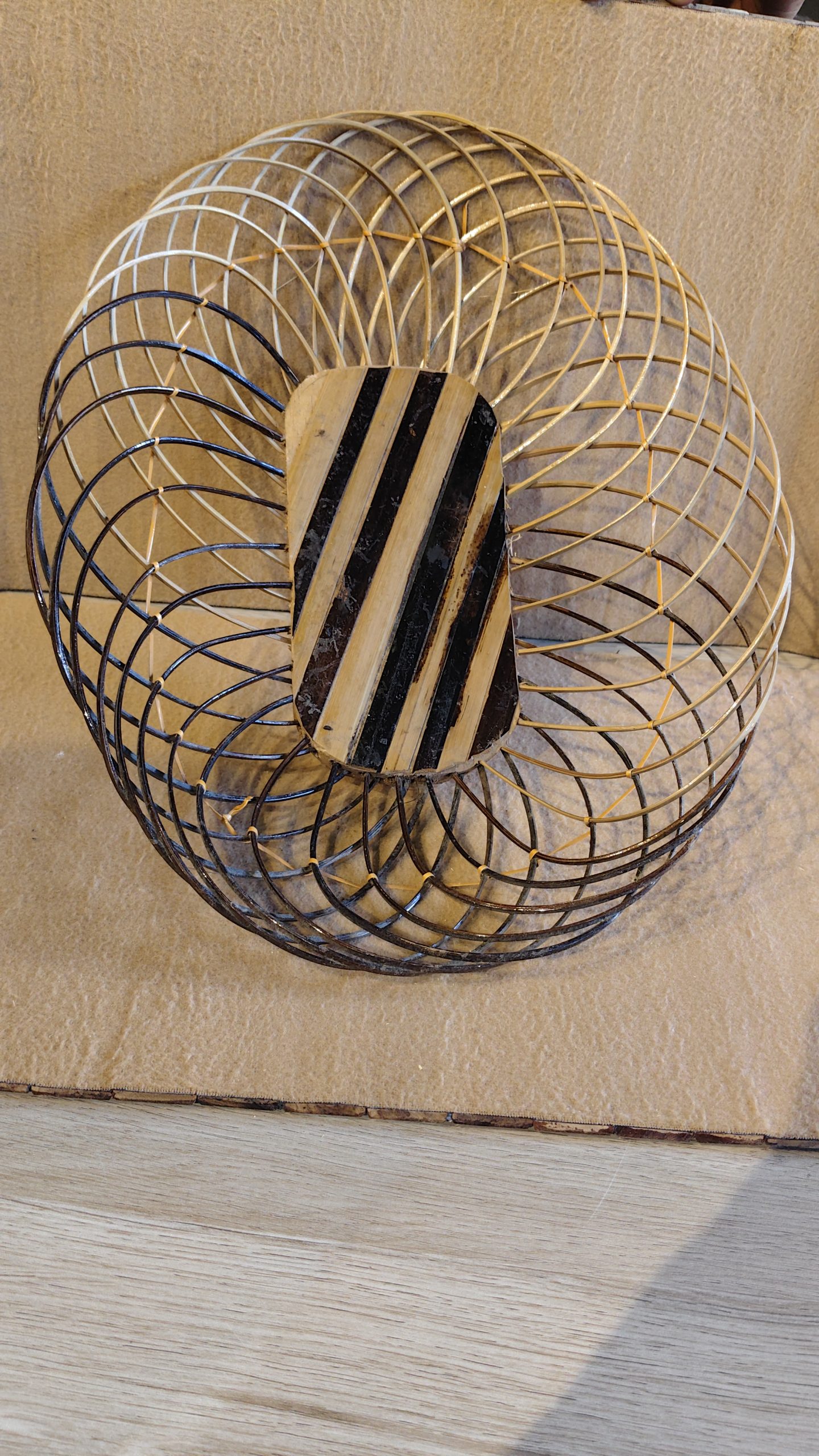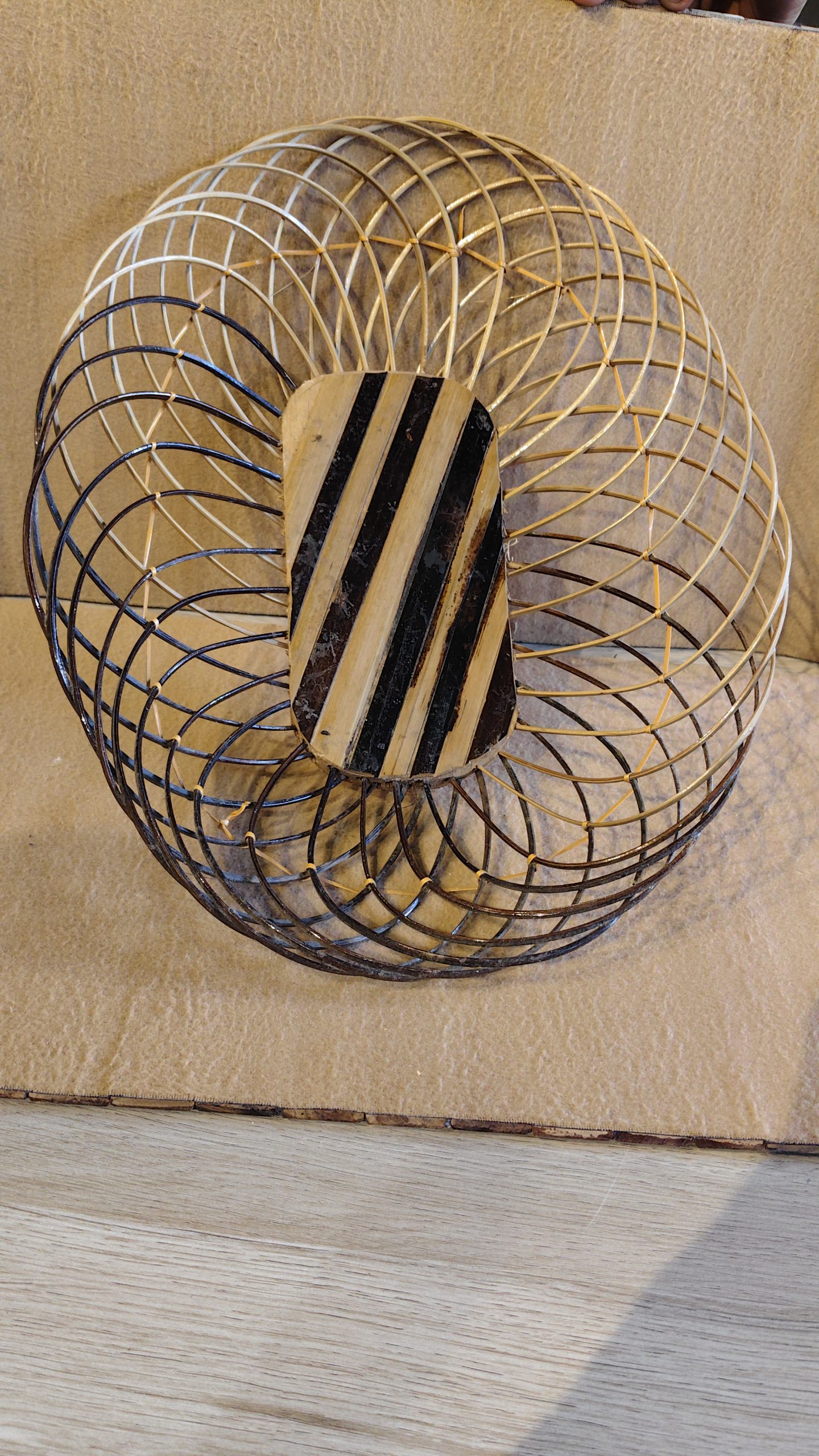 The natural tones of the bamboo, ranging from light tan to a darker, honey brown, create a subtle, two-toned effect that adds to its rustic charm. The piece also features a central accent, a solid piece of polished wood with dark stripes, which adds a modern and artistic touch. This bowl is not designed for holding liquids or food; it is intended for use with decorative items like fruit, potpourri, or simply as a standalone piece of art. Its timeless design and earthy materials make it a perfect accent for any decor, from minimalist to rustic.