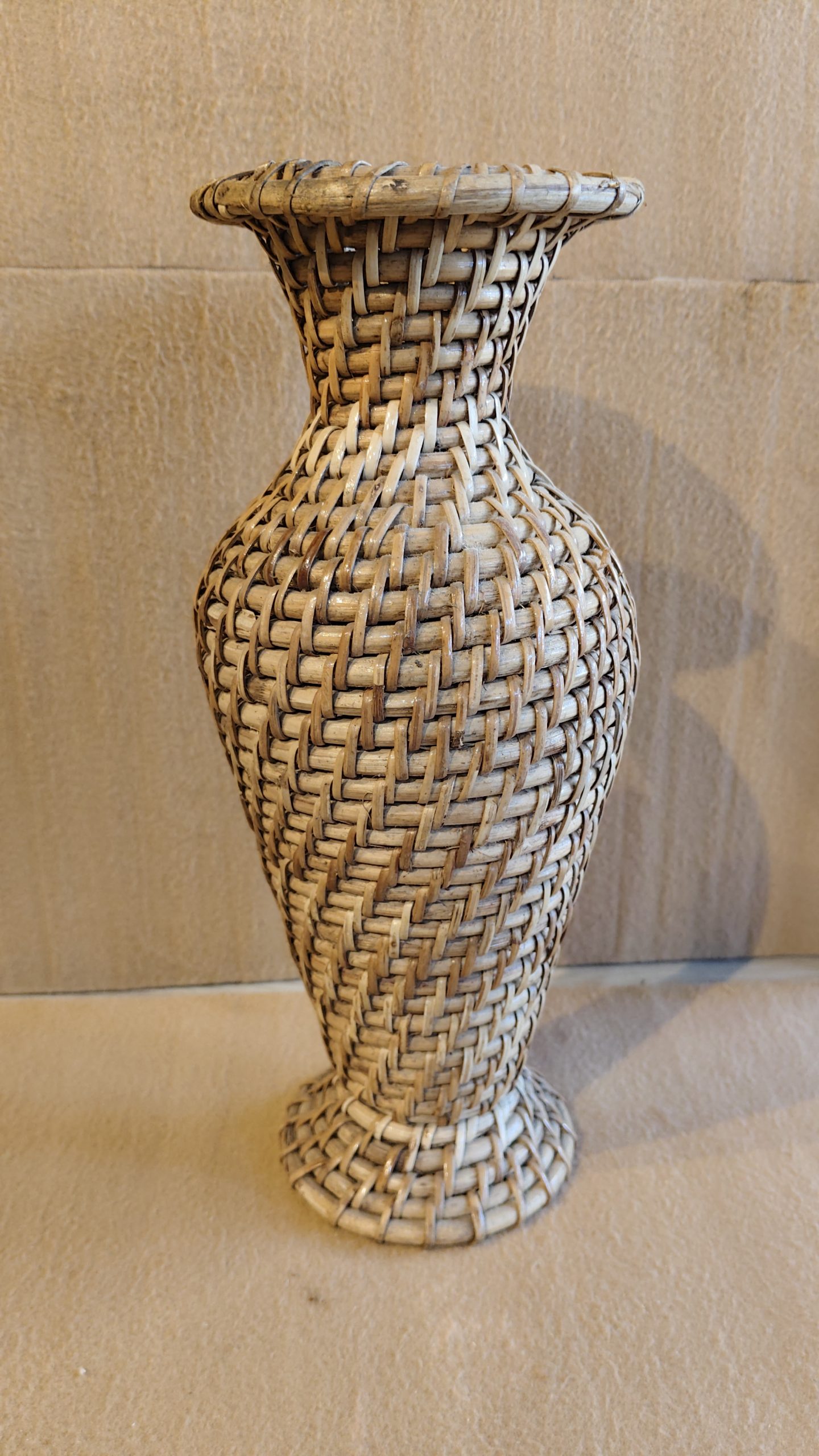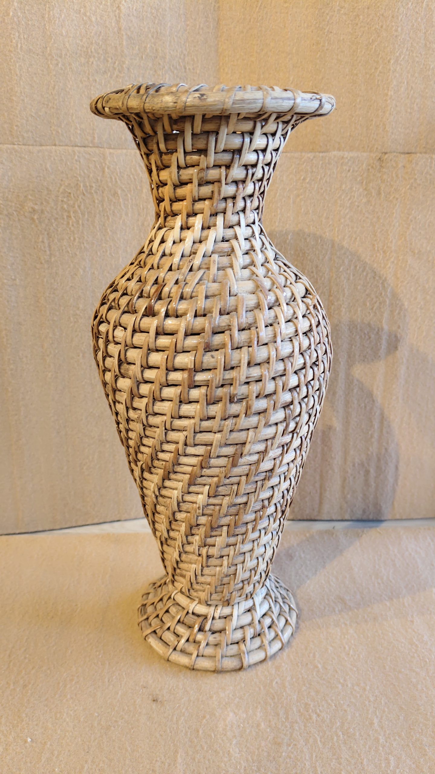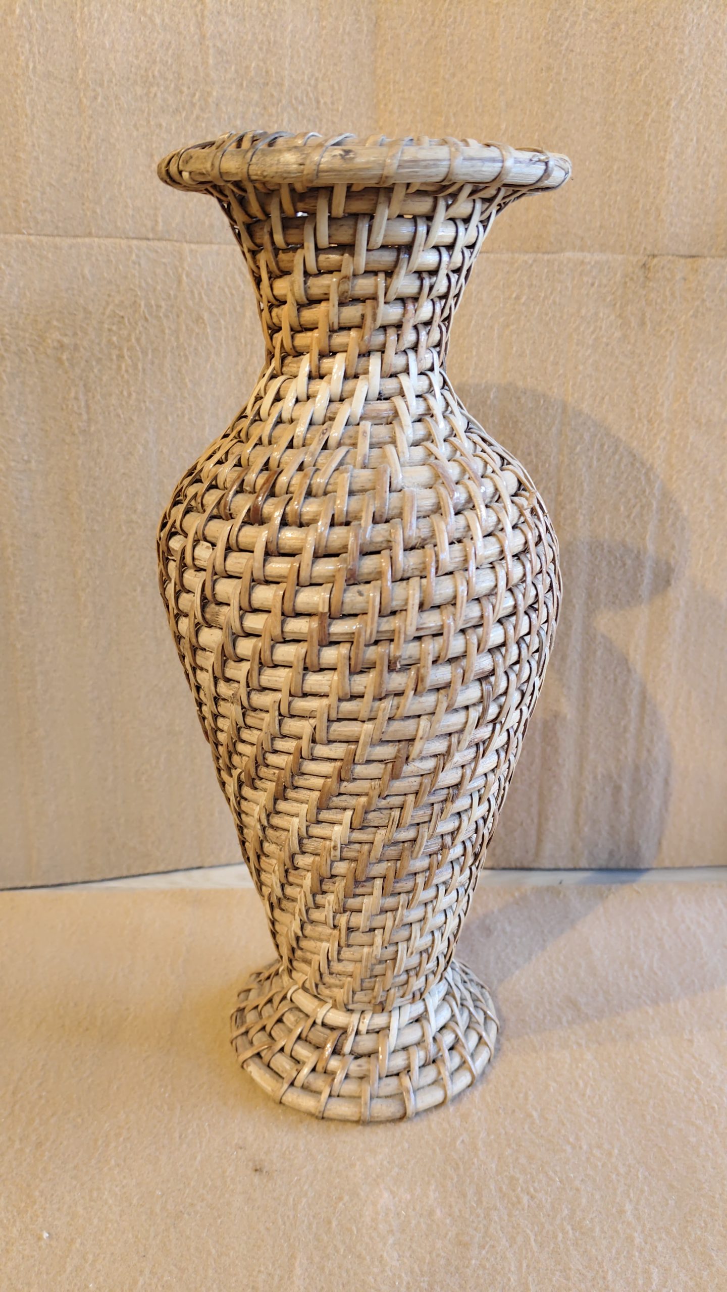This elegant, hand-woven decorative vase is a beautiful example of traditional craftsmanship and the natural beauty of sustainable materials. The vase has a classic silhouette, with a flared neck and a gently curved body that tapers down to a sturdy, flat base. It is meticulously woven from natural bamboo or cane sticks, creating a beautiful and intricate texture. The weaving technique features a spiral pattern that wraps around the body of the vase, adding a sense of dynamic movement and visual interest.