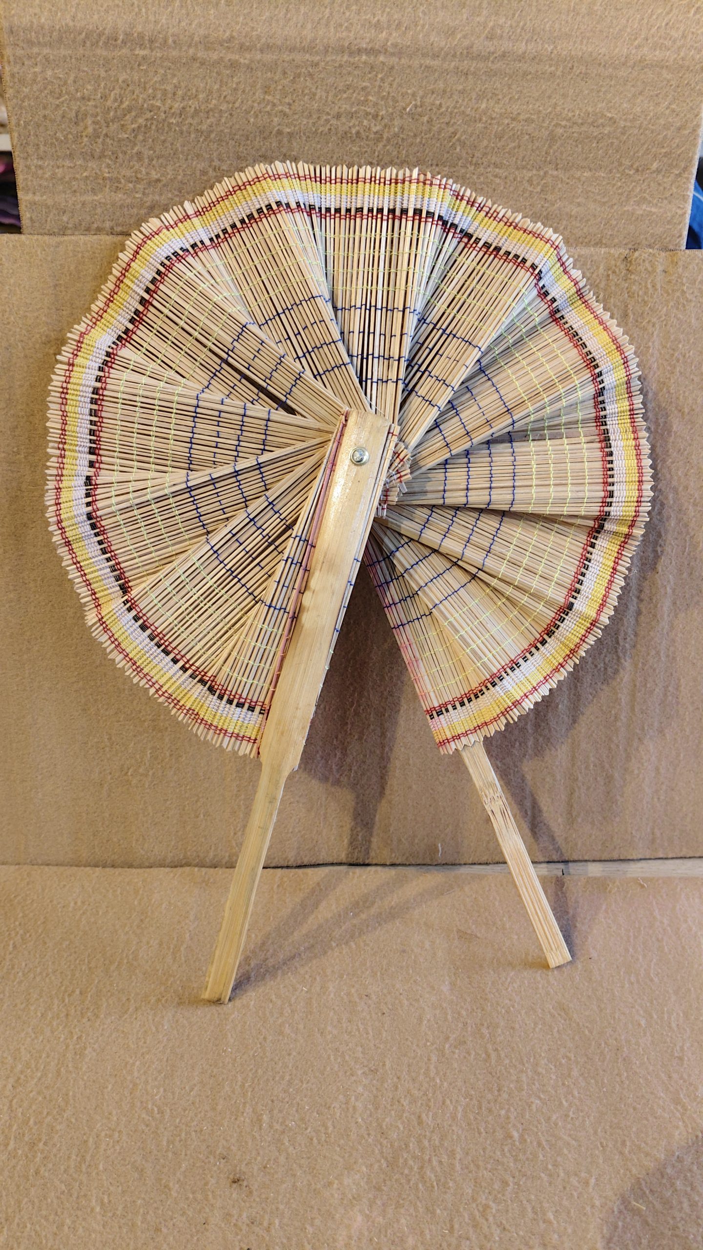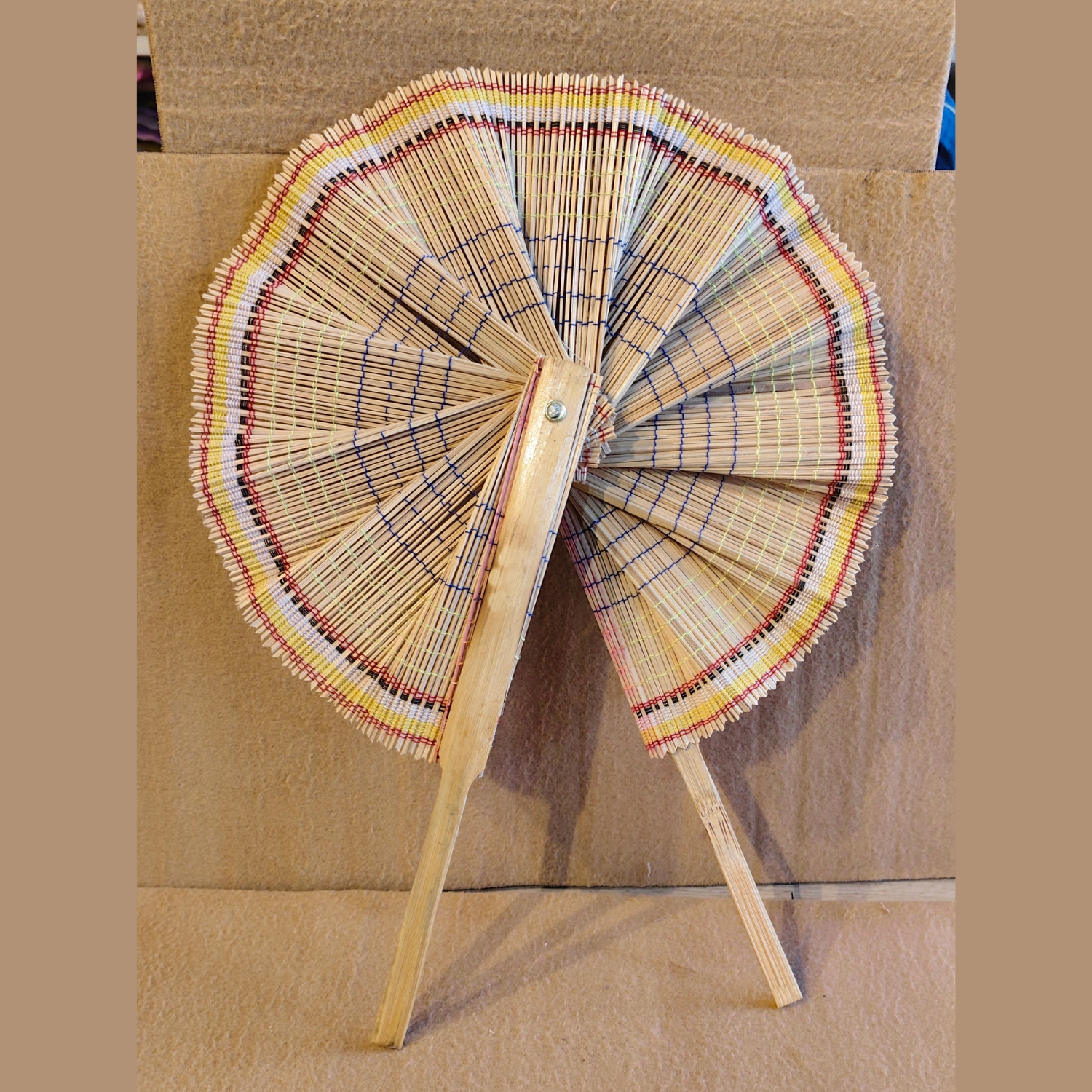 This beautiful, hand-woven folding fan is a perfect blend of traditional craftsmanship and natural, rustic design. The fan is meticulously crafted from thin bamboo or reed sticks, which are fanned out and held together at the base by a small metal pin. The sticks are woven together with delicate threads, creating a unique, circular pattern. The edges of the fan are decorated with a border of colorful threads in red, yellow, and white, adding a lively and vibrant touch.
