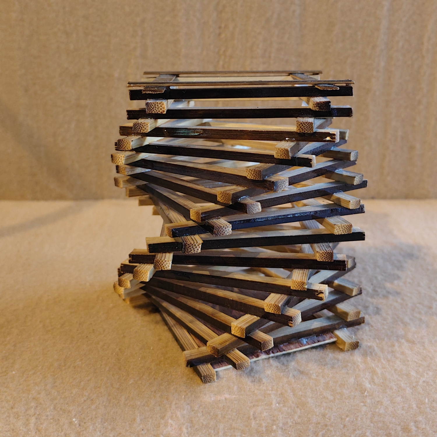 This unique, handcrafted sculpture is a fascinating piece of modern folk art. It is constructed from a series of thin bamboo sticks, arranged in a way that creates a mesmerizing spiral shape. The sticks are joined at the ends, forming a horizontal layer, and each subsequent layer is slightly rotated, giving the entire piece a sense of upward, spiraling motion.