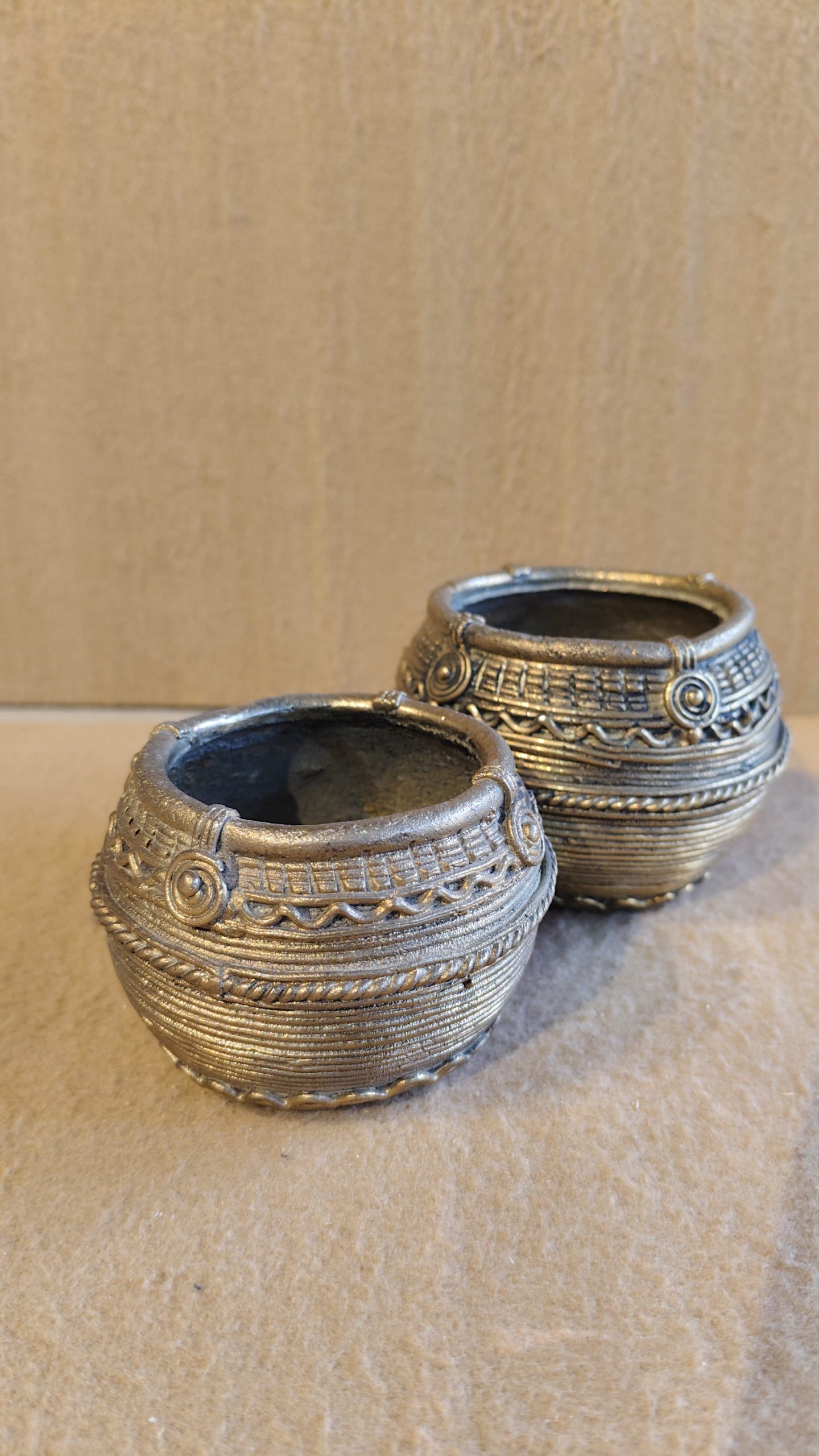 This exquisite set of two decorative bowls is a stunning example of Dhokra art, a traditional, non-ferrous metal casting craft practiced in various parts of India. The pieces are cast using the lost-wax technique, which results in intricate, detailed, and unique sculptures. The bowls have a classic, rounded form and are decorated with a beautiful array of patterns.