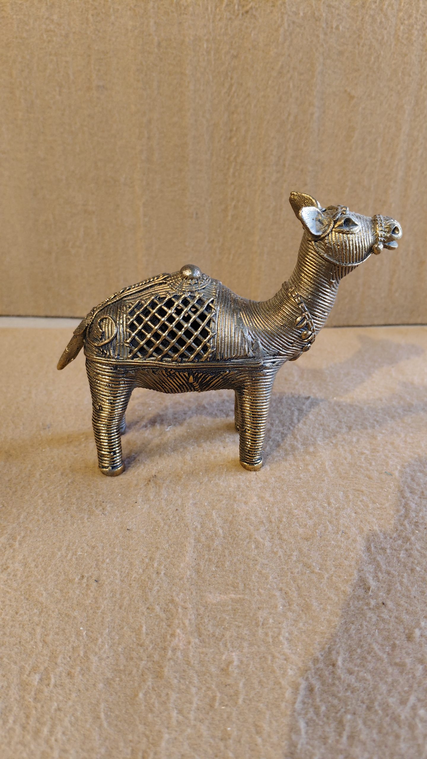 This exquisite camel figurine is a stunning example of Dhokra art, a traditional, non-ferrous metal casting craft practiced in various parts of India. The piece is cast using the lost-wax technique, which results in an intricate, detailed, and unique sculpture. The camel, a symbol of resilience and strength, is depicted with its head raised high, giving it a proud and regal appearance.