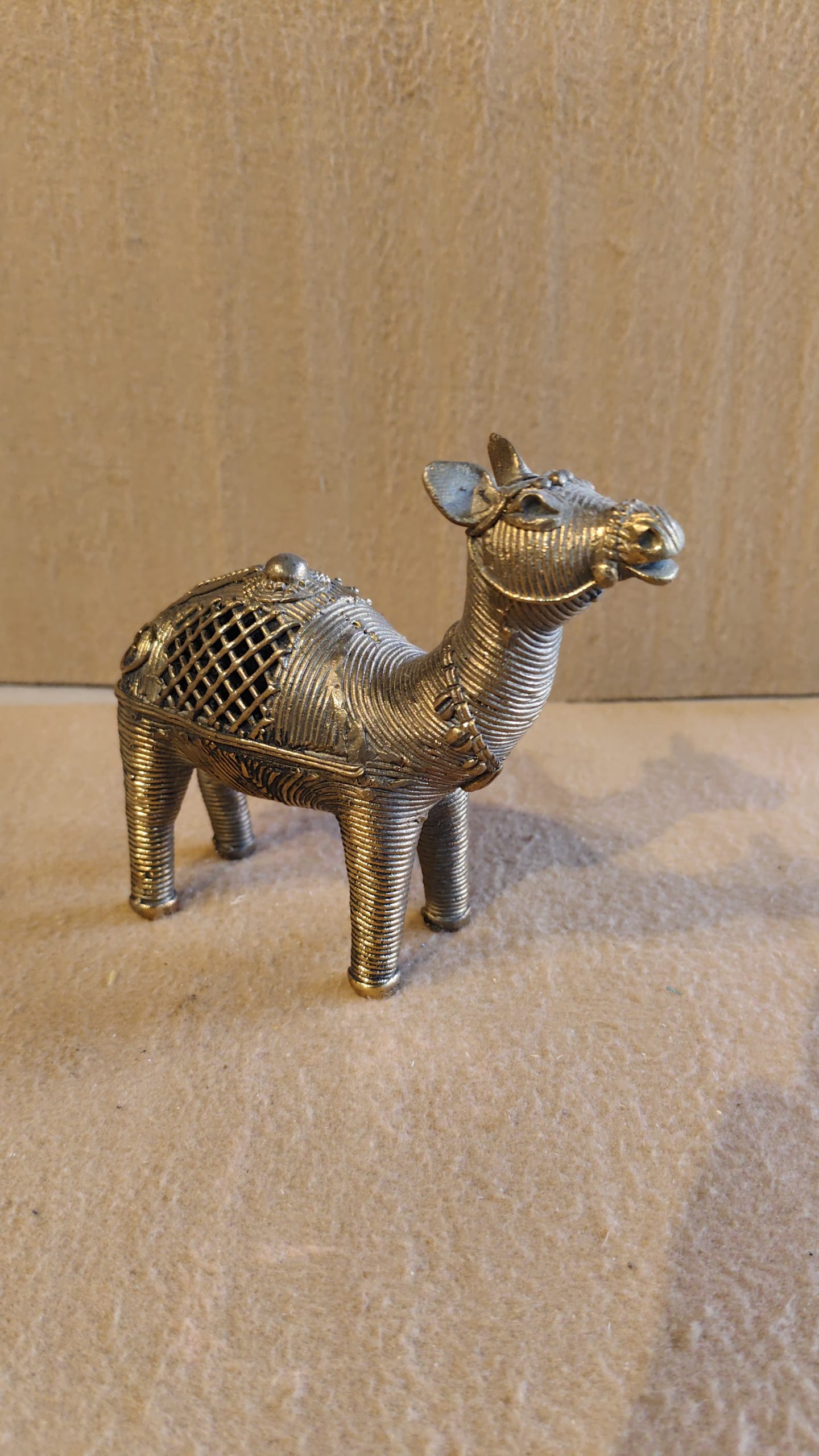 The surface of the figurine is a beautiful mix of solid wire work, creating a textured, rope-like look on the legs and body, and a delicate, open geometric latticework on its hump. This open design adds a delicate, lace-like quality that contrasts beautifully with the solid portions. The camel is also adorned with a finely detailed saddle and a beaded necklace. The entire piece has a beautiful antique brass finish that highlights the intricate details and gives it a timeless, authentic look. This figurine is a perfect blend of artistic expression and ancient craftsmanship, making it an elegant and unique decorative item for any home, office, or collection.