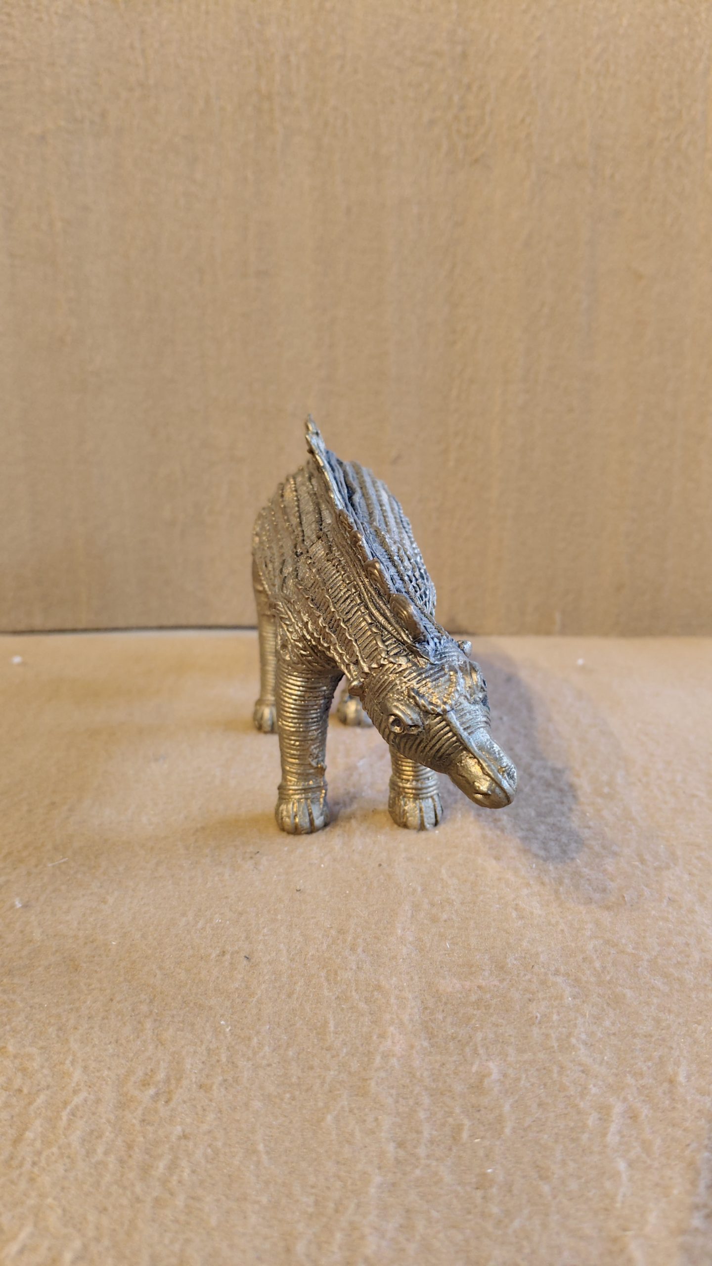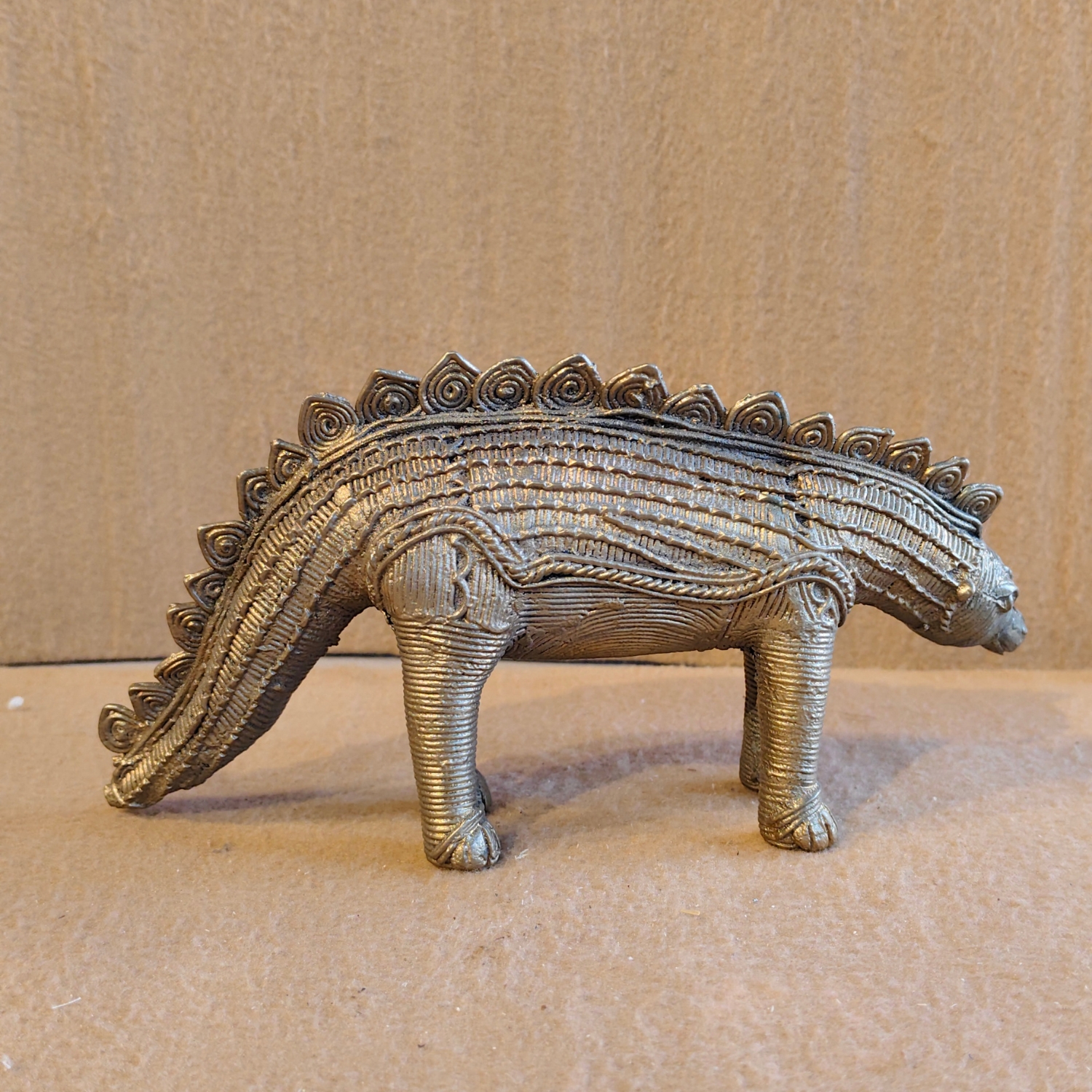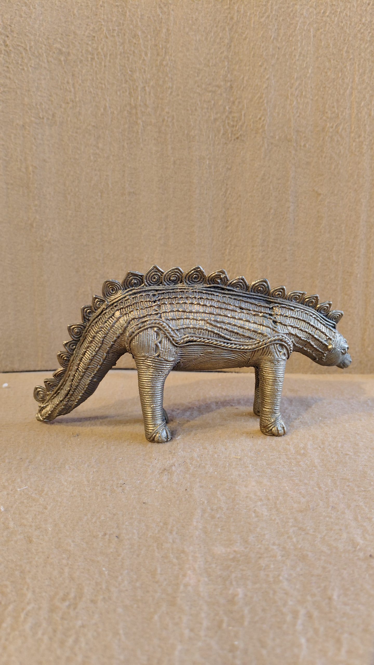 This unique and captivating dinosaur figurine is a modern and creative example of Dhokra art, a traditional, non-ferrous metal casting craft practiced in various parts of India. The piece is cast using the lost-wax technique, which results in an intricate, detailed, and one-of-a-kind sculpture. The dinosaur, which appears to be a stylized Stegosaurus, is depicted with a textured body and its signature row of plates along its back.