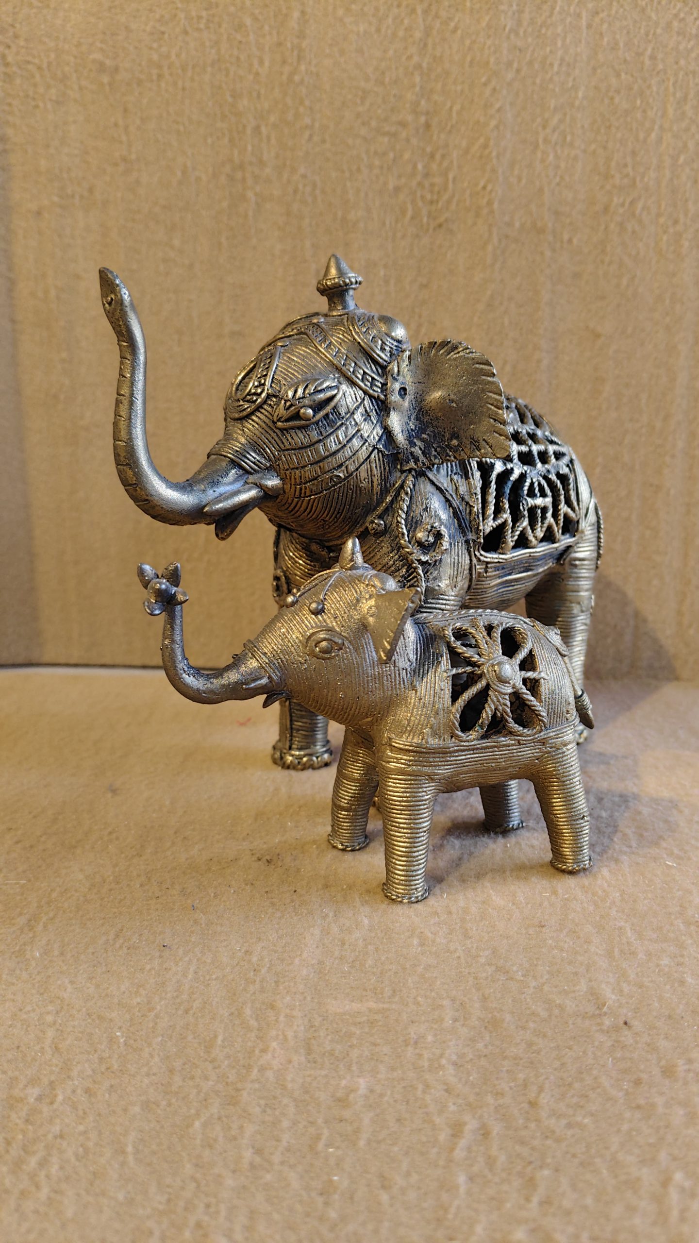 This exquisite set of two elephant figurines is a stunning example of Dhokra art, a traditional, non-ferrous metal casting craft practiced in various parts of India. The pieces are cast using the lost-wax technique, which results in intricate, detailed, and unique sculptures. The set depicts a large, stately mother elephant with her small, charming baby, symbolizing the bond between parent and child.