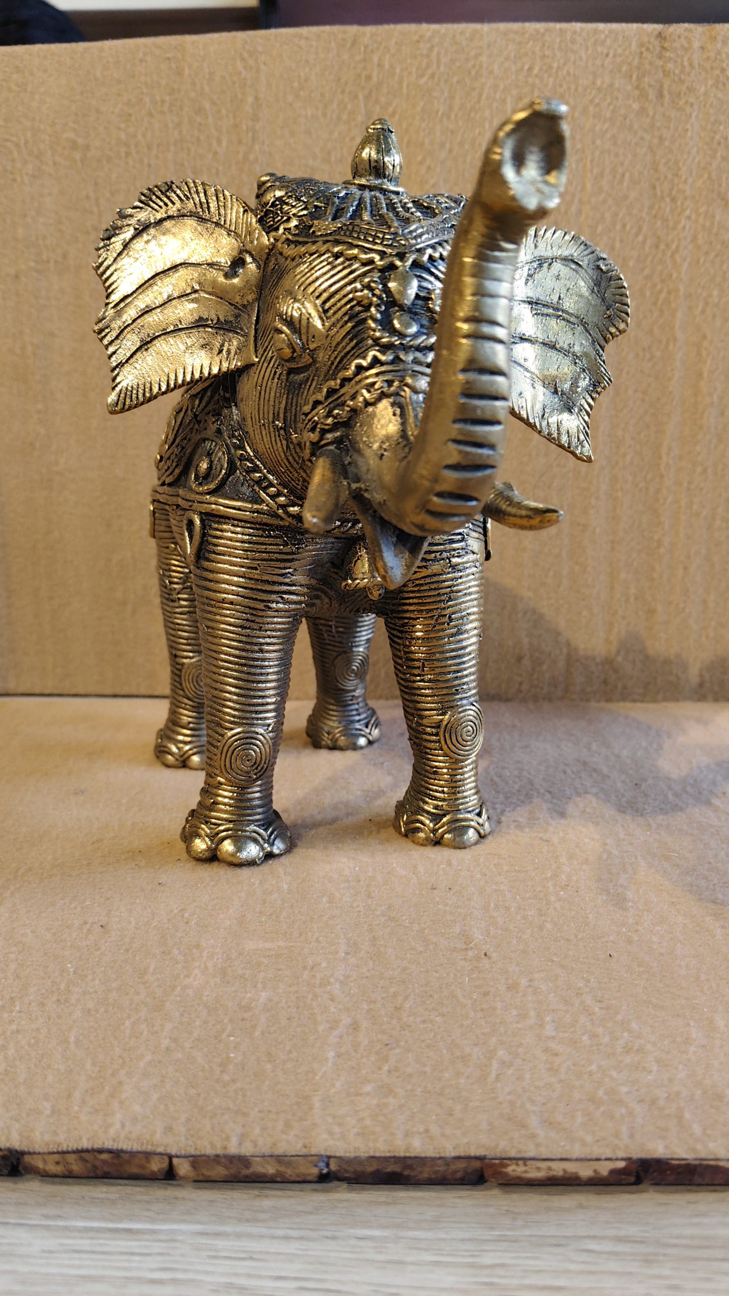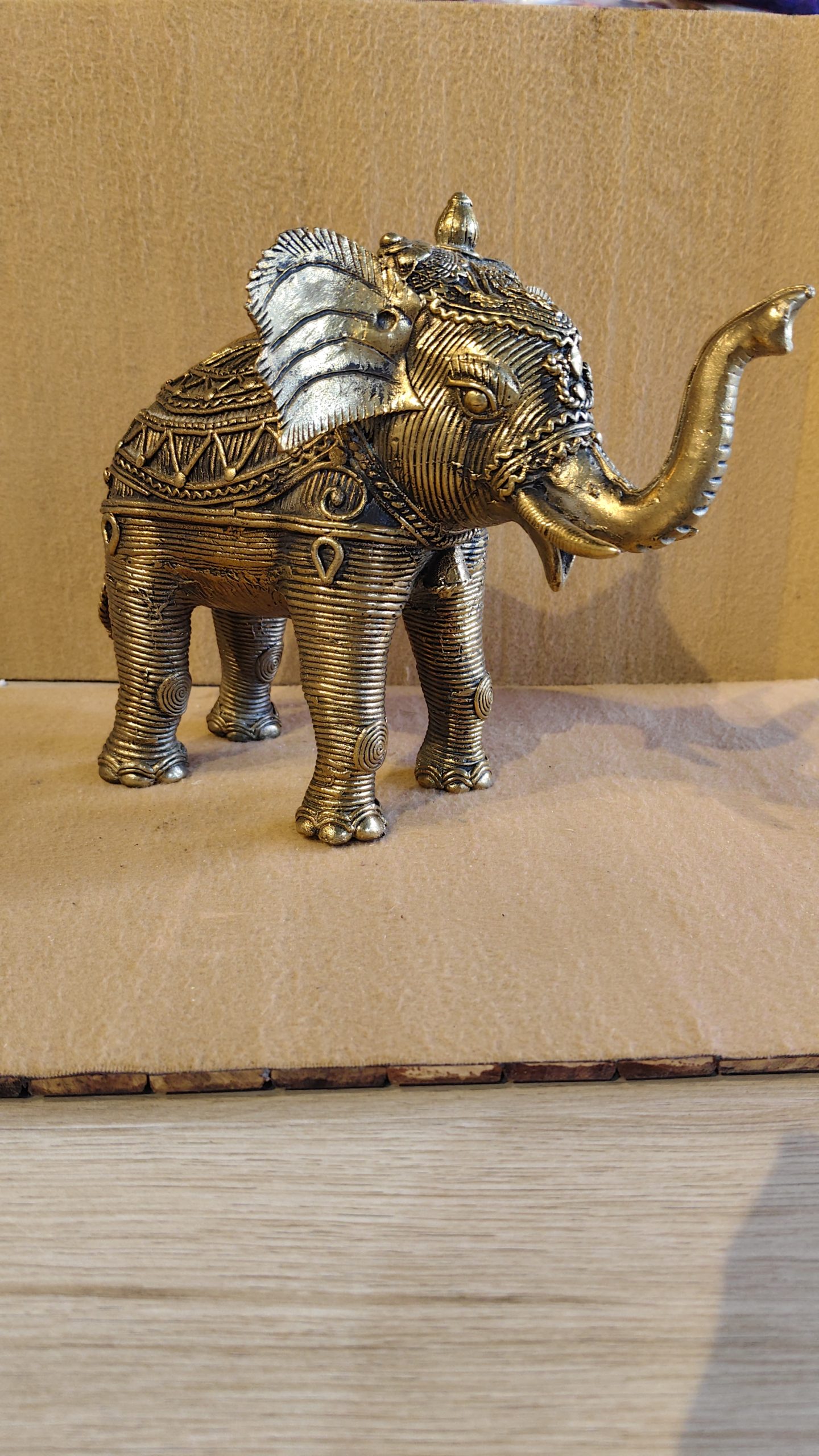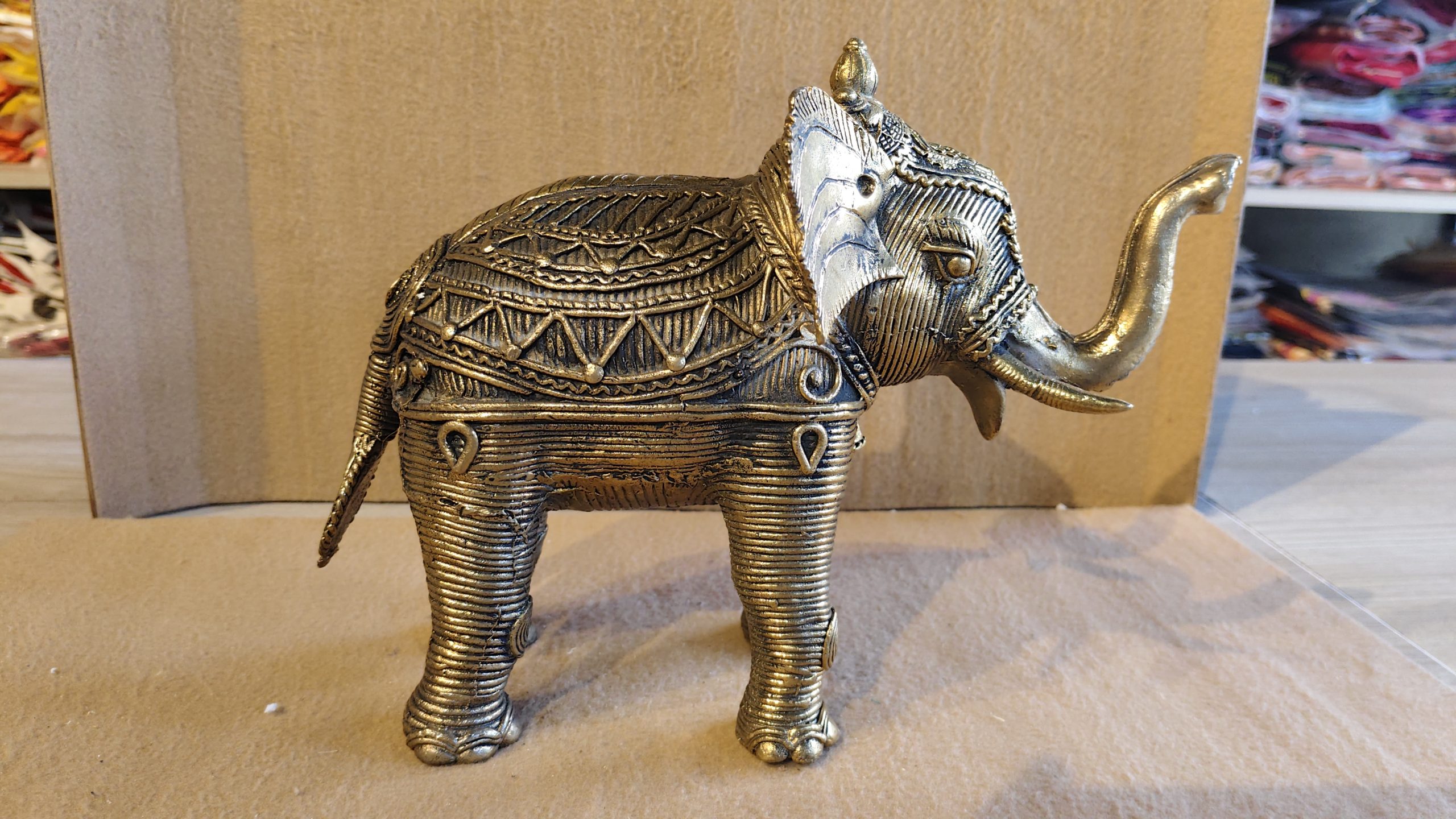 This exquisite elephant figurine is a stunning example of Dhokra art, a traditional, non-ferrous metal casting craft practiced in various parts of India. The piece is cast using the lost-wax technique, which results in an intricate, detailed, and unique sculpture. The elephant is depicted with its trunk raised in a welcoming gesture, and its body is adorned with rich details and a unique filigree design.