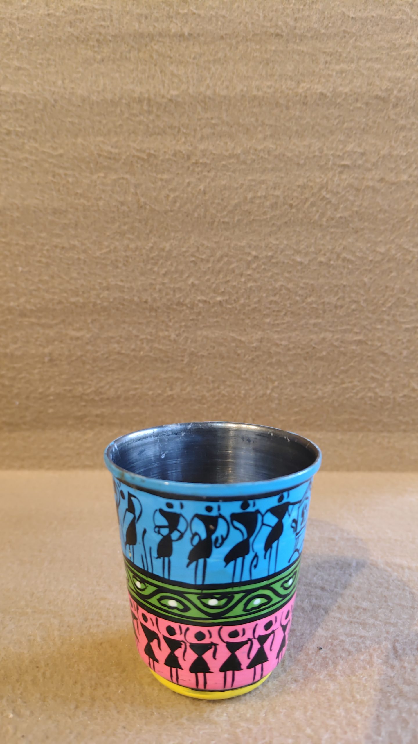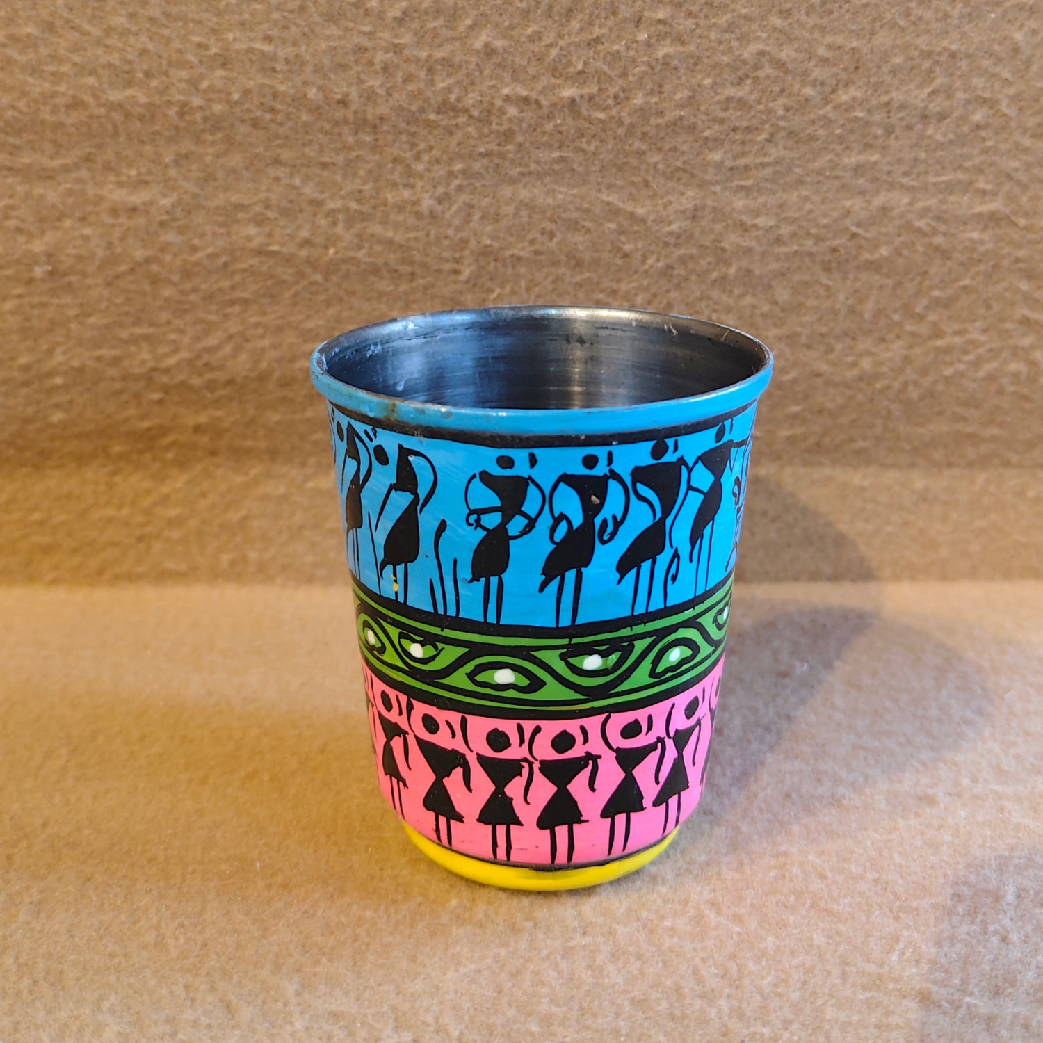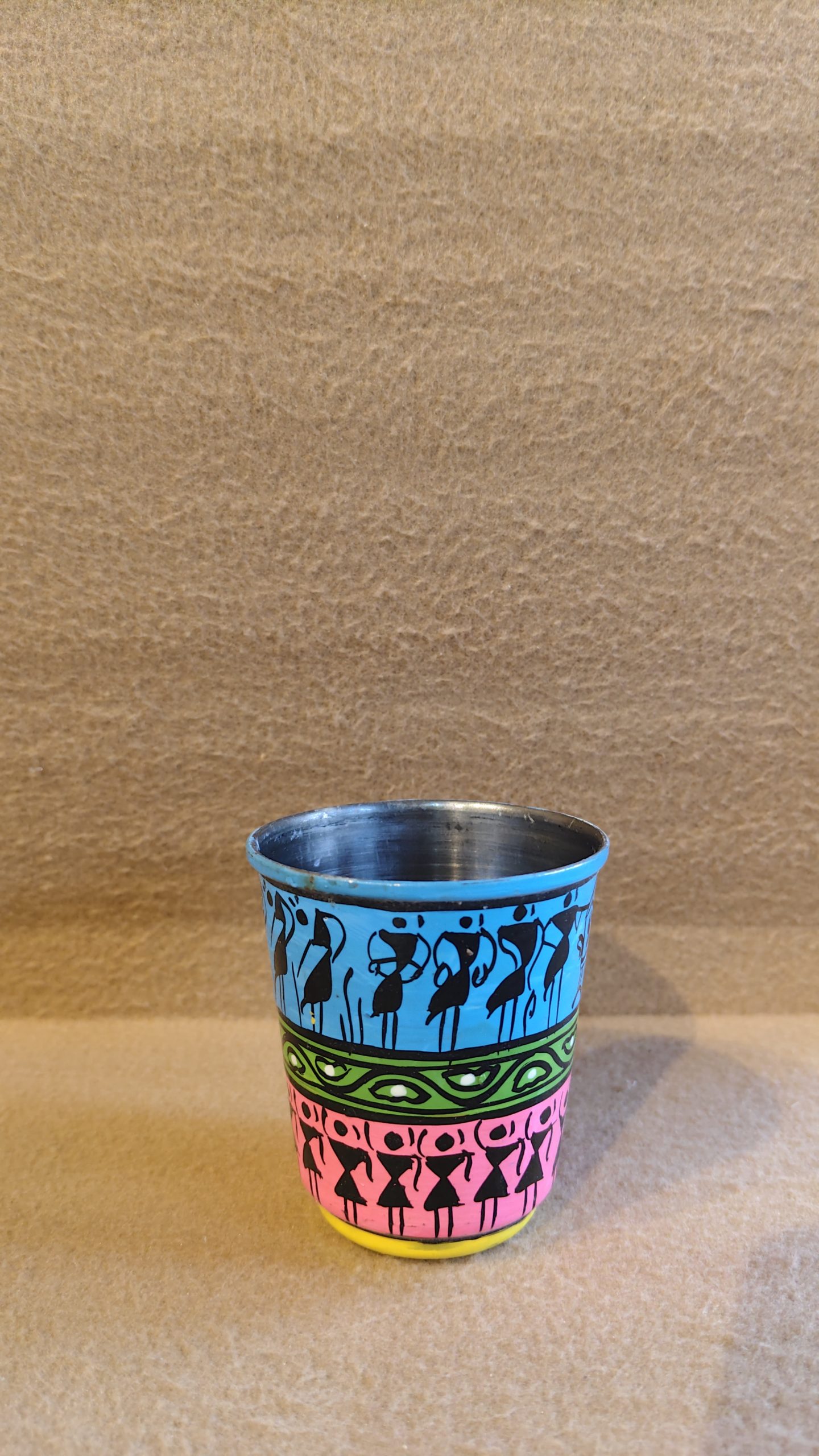 This charming, hand-painted metal tumbler blends traditional Indian Warli art with a modern, colorful design. The cylindrical cup features two distinct bands of decoration. The top band is a calming sky-blue, showcasing a lively scene of Warli figures, characterized by their simple geometric forms, engaged in a collective activity. The lower band, painted in a striking hot pink, features a different group of figures in a dynamic, dancing pose, their movements suggesting a festive celebration. The design is unified by the use of black and white outlines and highlights, which create a beautiful contrast against the bright backgrounds.
