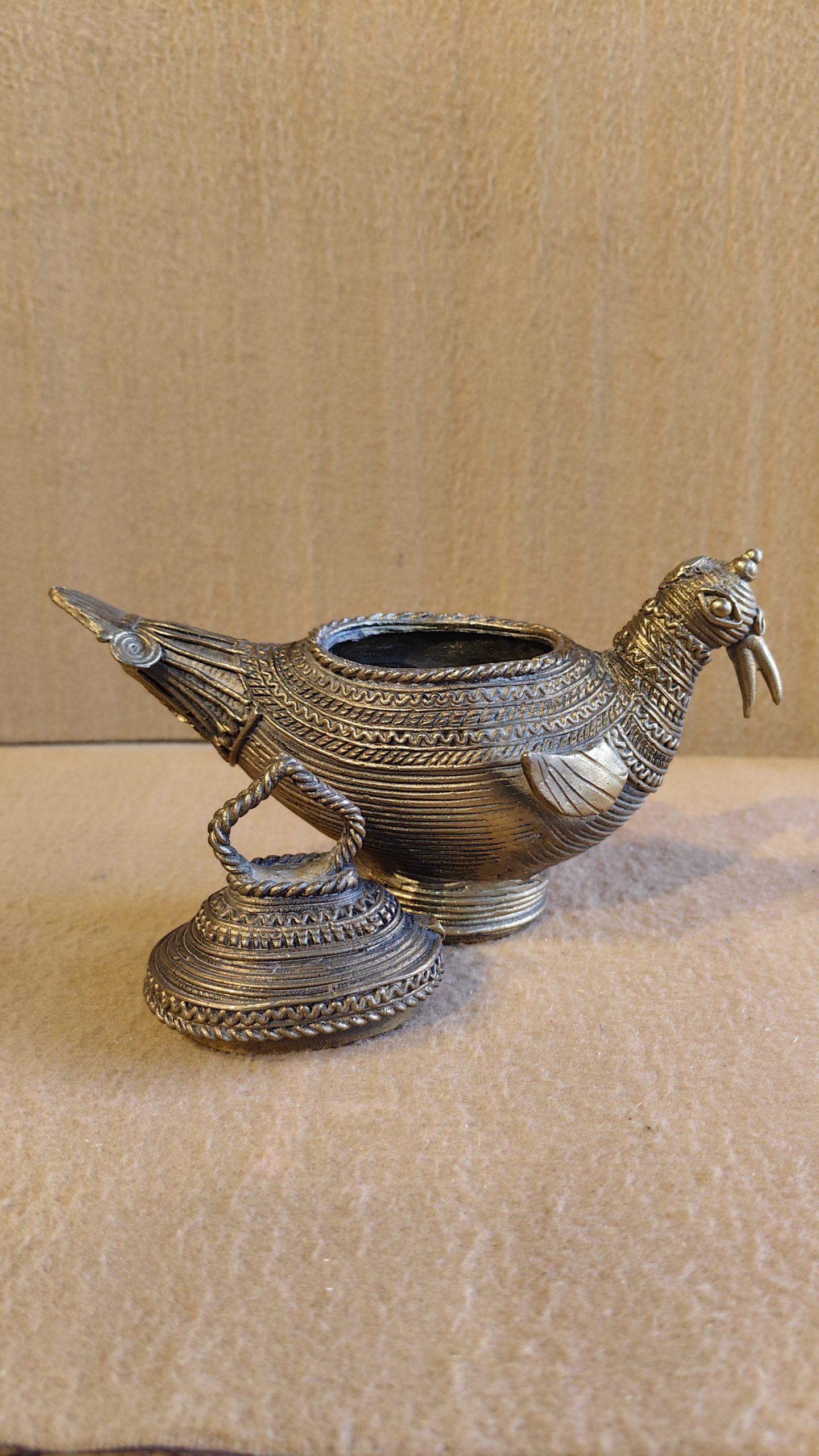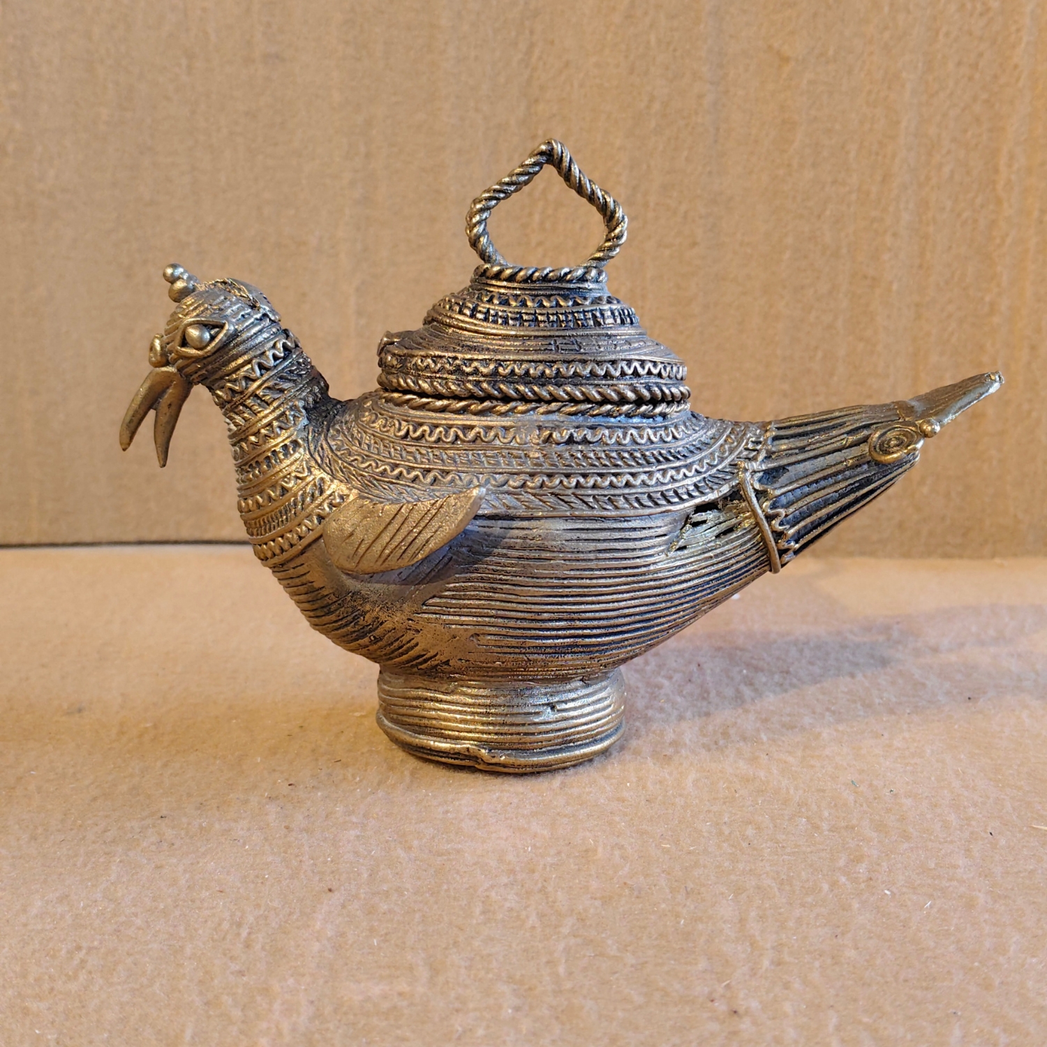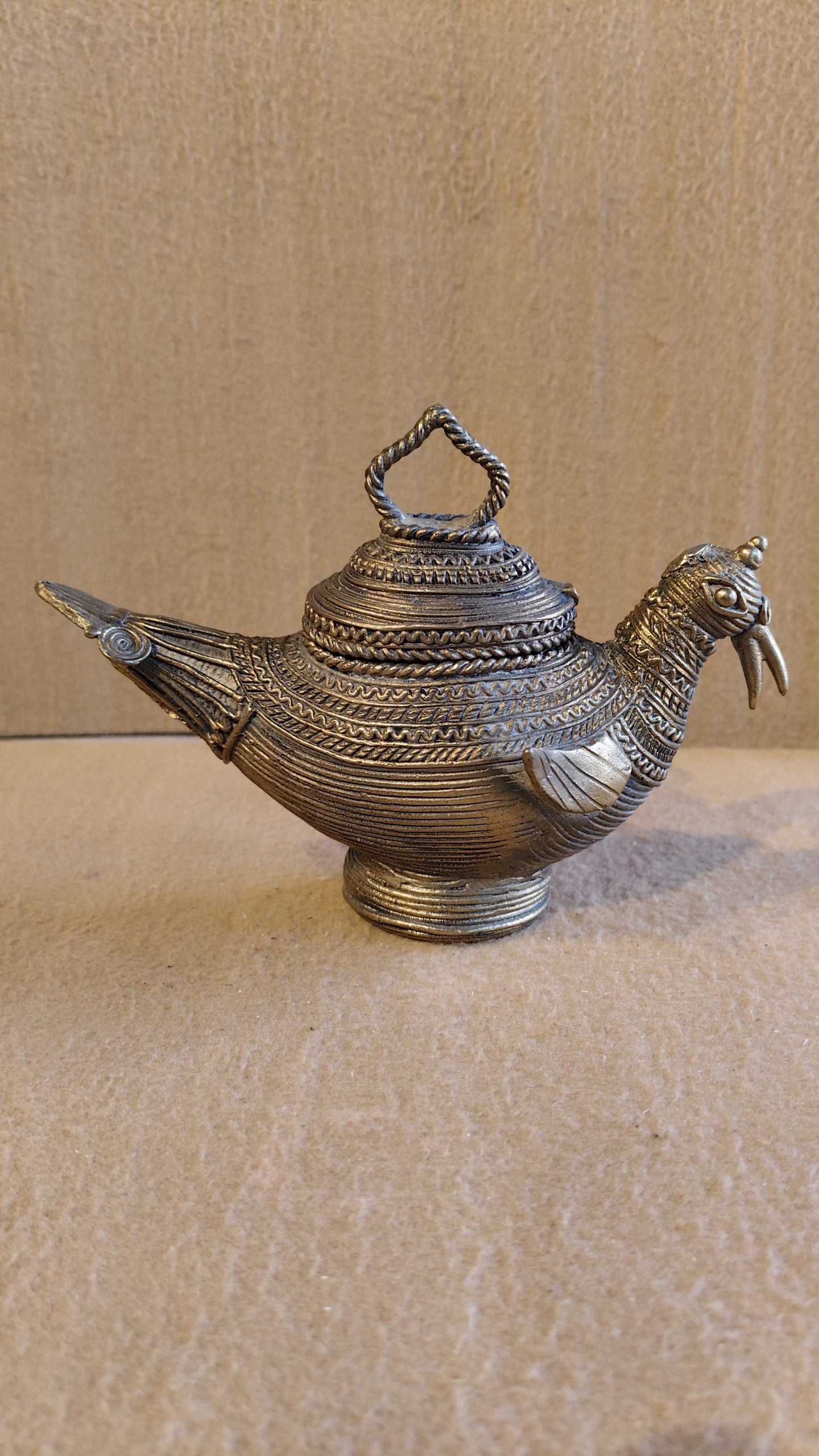 This is a unique, bird-shaped vessel made of metal, likely brass or a similar alloy, with a distinct, rustic appearance. The design and the coiling of the metal strongly suggest it is a piece of Dhokra art, an ancient Indian folk art form. The body of the bird is a container with a lid, and it has a handle on top. The bird is depicted with a detailed head and tail, and the body is decorated with horizontal lines and a twisted rope-like pattern.