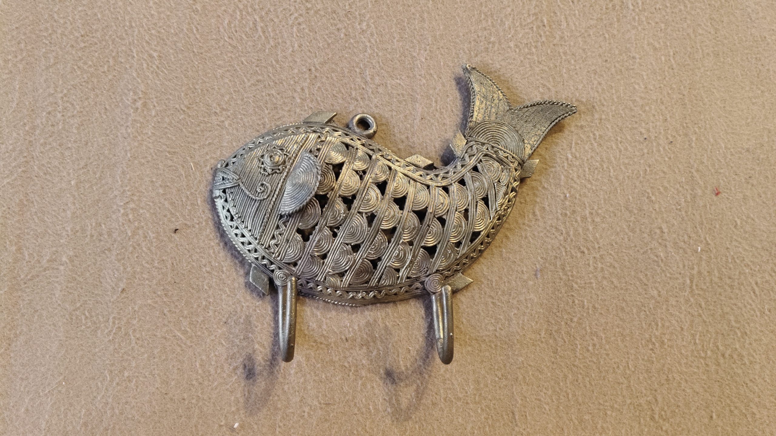 - Design: A stylized fish figure with a highly decorative body. The filigree work on the body gives the appearance of scales. The head and tail are also meticulously detailed. Two functional hooks extend from the bottom.