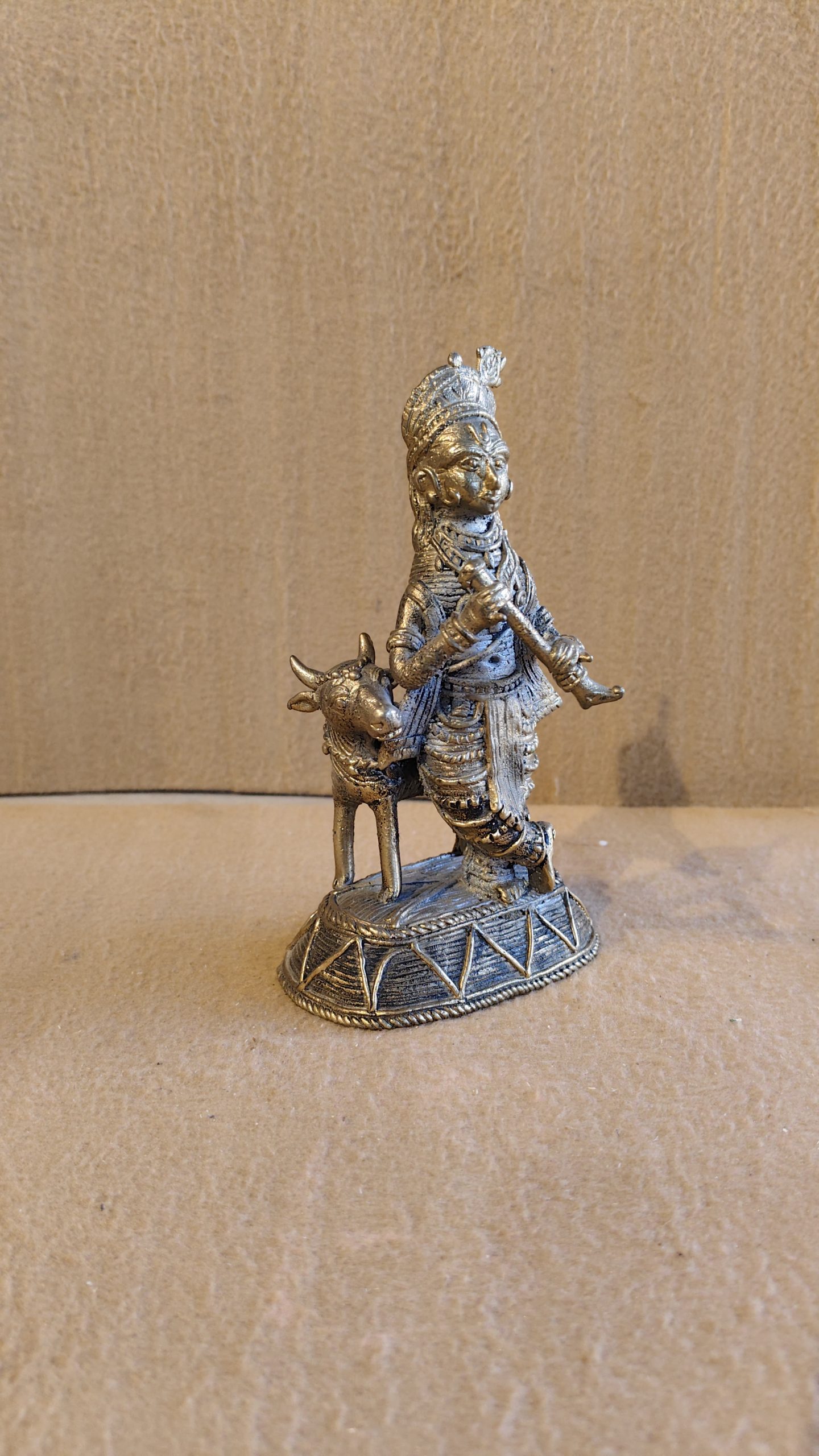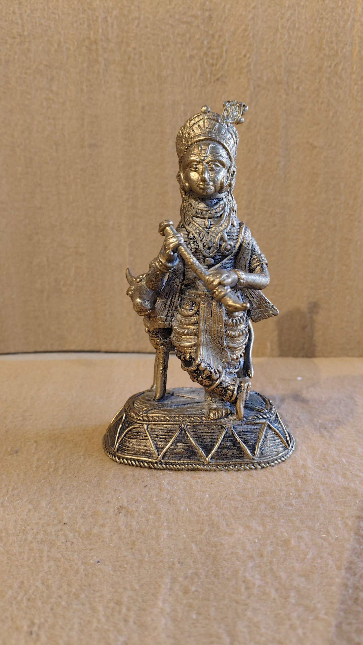 This is a finely detailed figurine of the Hindu deity Lord Krishna, likely crafted from brass or a similar metal alloy. The statue depicts Krishna in his iconic standing posture, playing his flute (bansuri). A small cow or calf is often shown standing beside him, which is a symbolic representation of his role as a cowherd in Hindu mythology. Krishna is adorned with a traditional peacock feather in his crown, along with a variety of jewelry and robes. The entire piece stands on a decorative, tiered base. This figurine serves as a religious idol for worship, a decorative piece for a home altar (puja room), or as a collector’s item of religious art.