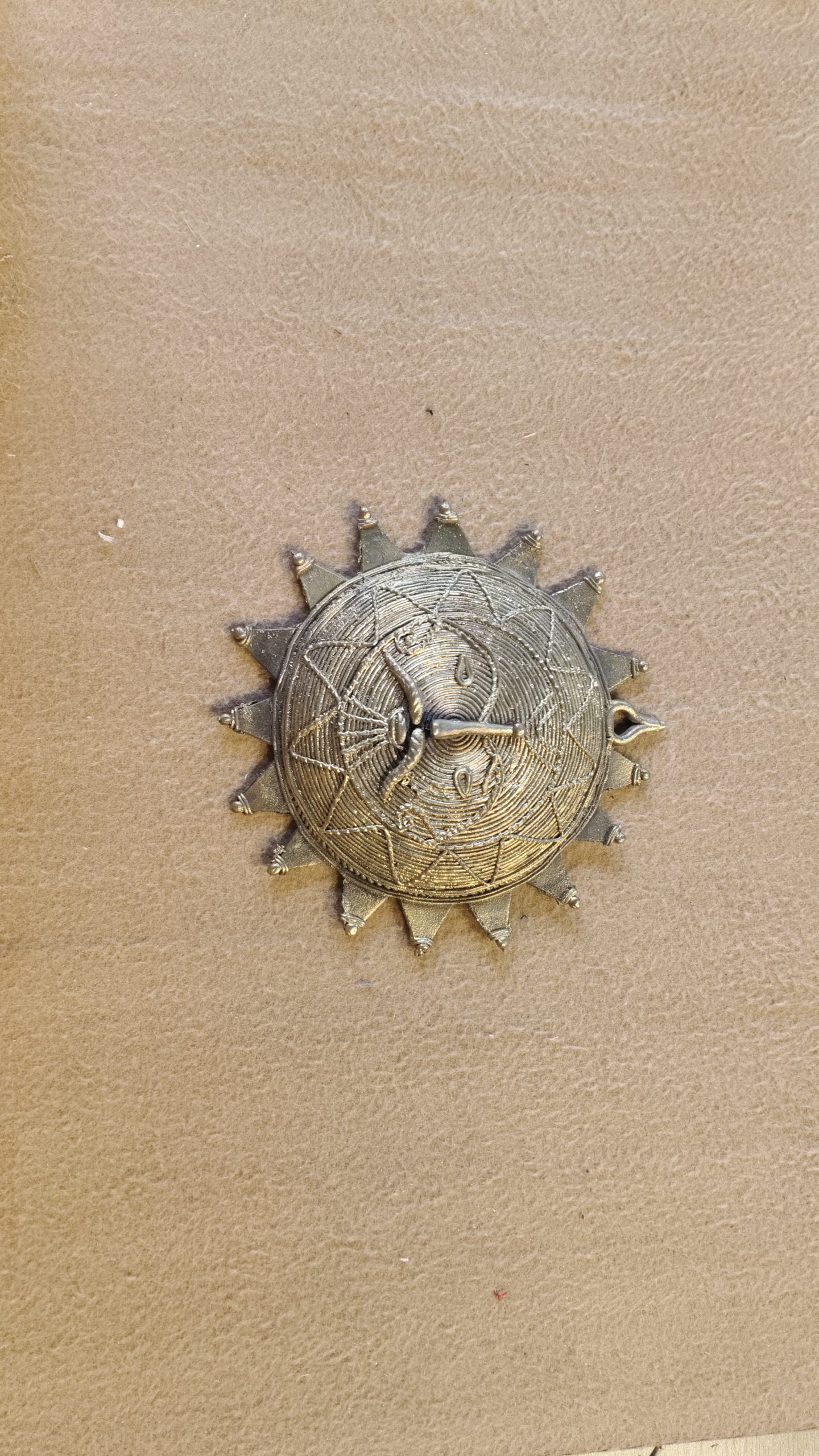 - Design: A circular medallion in the shape of a sun, with a central disc and radiating triangular rays. The central disc is decorated with a mythological figure and intricate, concentric patterns.