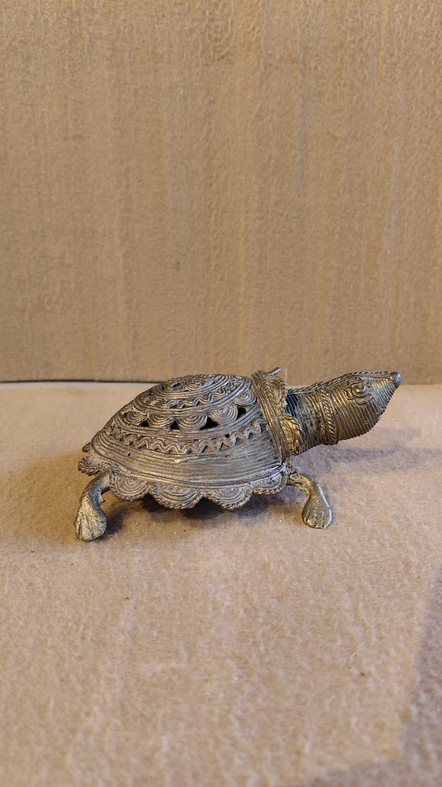 This is a small, hollow figurine of a tortoise or turtle, likely made from brass or a similar metal alloy. The design is a mix of solid casting and open filigree-style work, which is concentrated on the shell. The head, tail, and legs are solid, while the shell has intricate cut-out patterns and is decorated with fine, coiled metal lines. The hollow body and the openings in the shell suggest that this item is an incense holder or burner. An incense stick or cone would be placed inside, and the smoke would waft out through the openings in the shell. The piece has a rustic, handcrafted feel, possibly made using a lost-wax casting technique.
